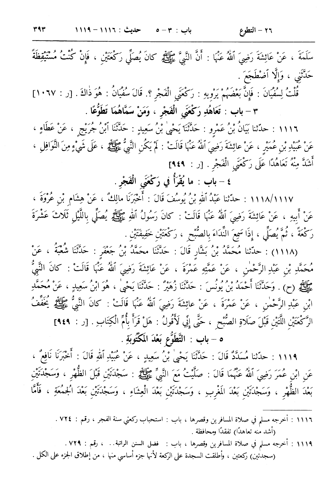 : لم يكن النبي صلى الله عليه و سلم على شيء من النوافل أشد منه تعاهدا على ركعتي الفجر