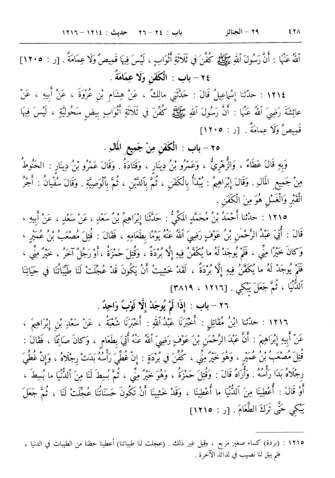 27 - باب إذا لم يجد كفنا إلا ما يواري رأسه أو قدميه غطى رأسه