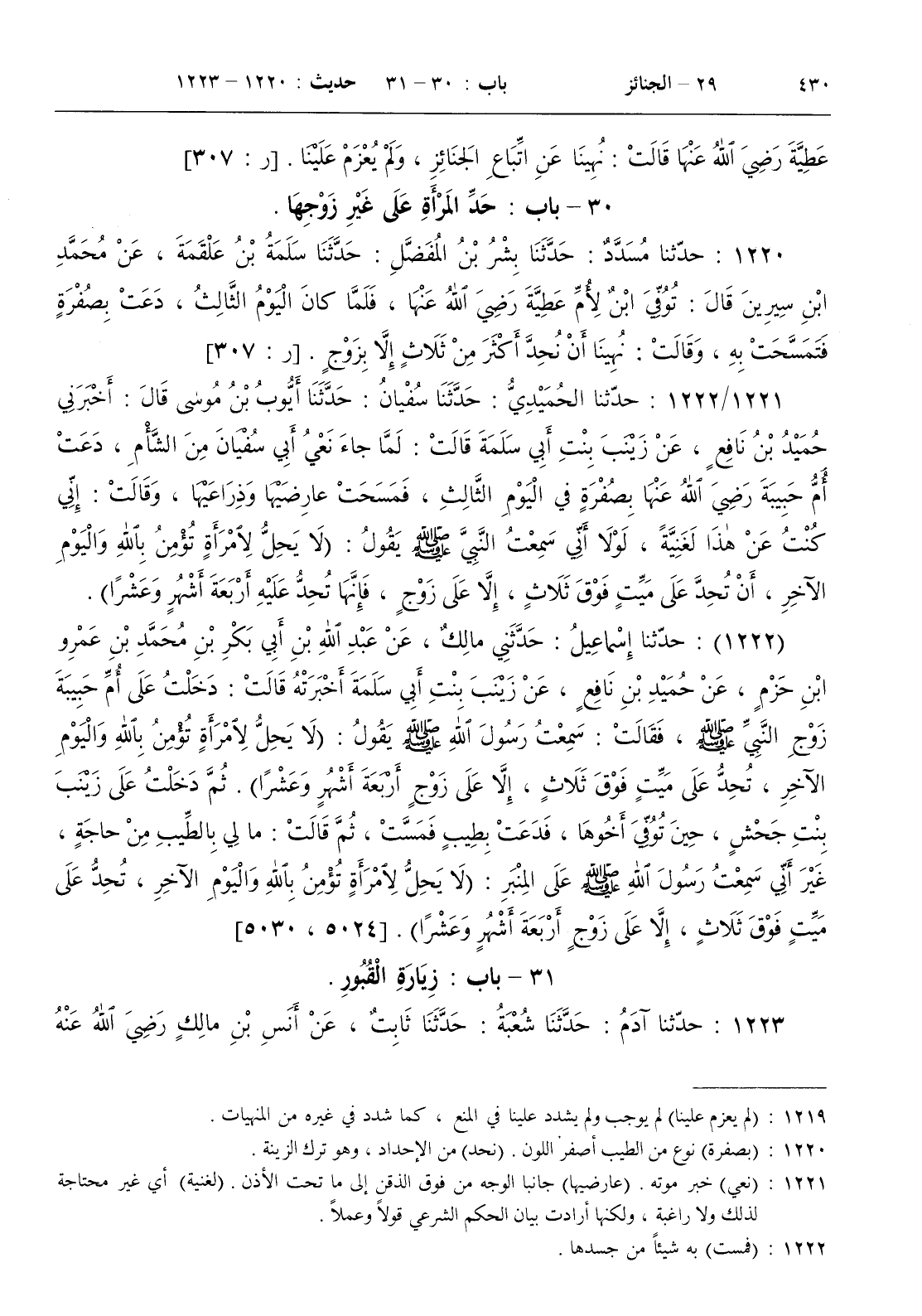 : دخلت على أم حبيبة زوج النبي صلى الله عليه و سلم فقالت سمعت رسول الله صلى الله عليه و سلم يقول ( لا يحل لامرأة تؤمن بالله واليوم الآخر تحد على ميت فوق ثلاث إلا على زوج أربعة أشهر وعشرا ) . ثم دخلت على زينب بنت جحش حين توفي أخوها فدعت بطيب فمست ثم قالت ما لي بالطيب من حاجة غير أني سمعت رسول الله صلى الله عليه و سلم على المنبر ( لا يحل لامرأة تؤمن بالله واليوم الآخر تحد على ميت فوق ثلاث إلا على زوج أربعة أشهر وعشرا )
