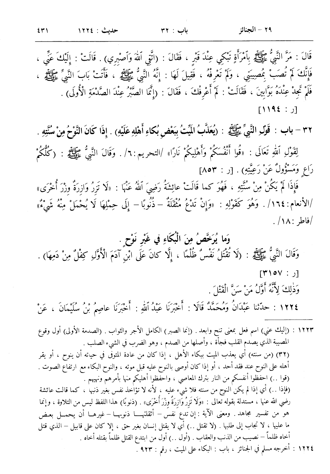 ( ابنة ) هي زينب رضي الله عنها . ( قبض ) قرب أن يقبض أي يموت . ( لله ما أخذ وله ما أعطى ) له الخلق كله يتصرف به إيجادا وعدما . ( بأجل مسمى ) مقدر بوقت معلوم محدد . ( ولتحتسب ) تطلب بصبرها الأجر والثواب من الله تعالى ليحسبه لها من أعمالها الصالحة . ( تتقعقع ) تتحرك وتضطرب ويسمع لها صوت . ( شن ) السقاء البالي . ( ففاضت عيناه ) نزل الدمع من عيني النبي صلى الله عليه و سلم . ( ما هذا ) استفهام تعجب لما يعلم من سنة صبره ونهيه عن البكاء . ( هذا رحمة ) هذه الدمعة أثر رحمة وليست من الجزع وقلة الصبر ]