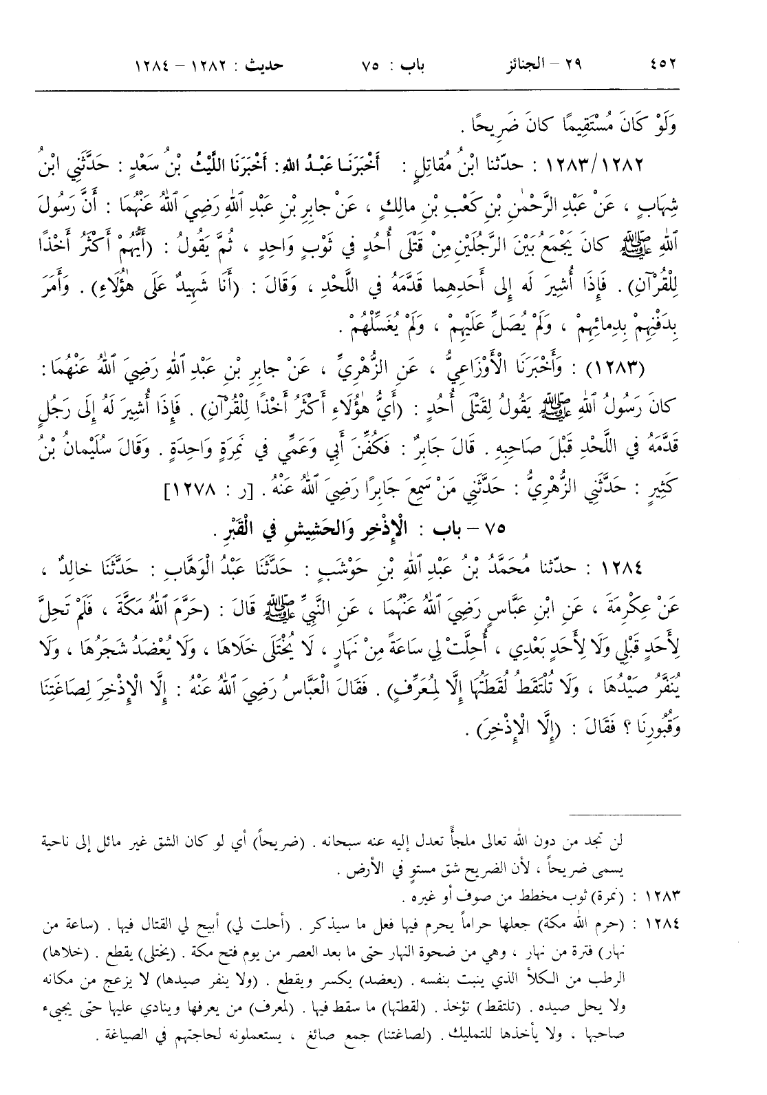 : كان رسول الله صلى الله عليه و سلم يقول لقتلى أحد ( أي هؤلاء أكثر أخذا للقرآن ) . فإذا أشير له إلى رجل قدمه في اللحد قبل صاحبه . قال جابر فكفن أبي وعمي في نمرة واحدة . وقال سليمان بن كثير حدثني الزهري حدثني من سمع جابر رضي الله عنه