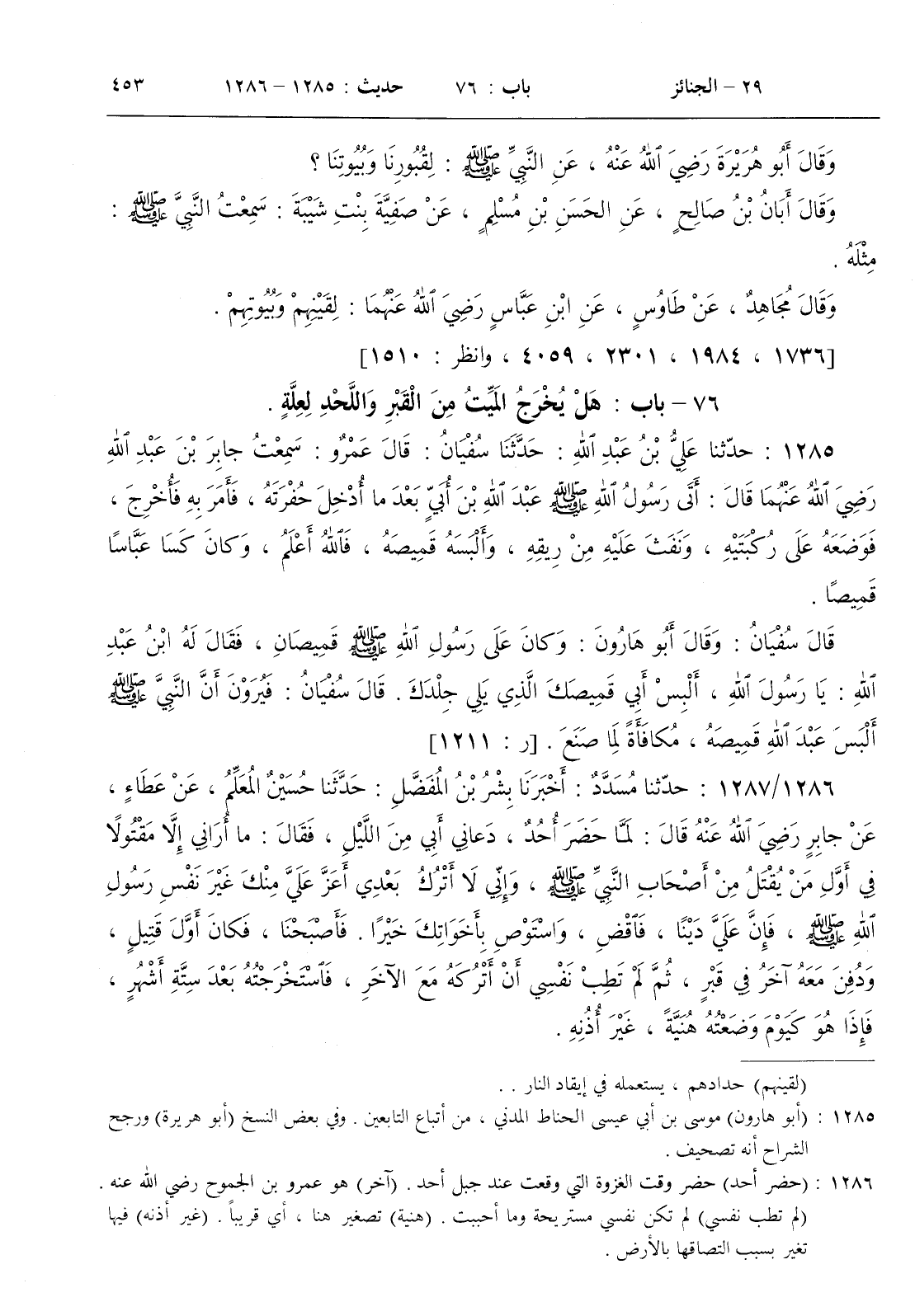 : لما حضر أحد دعاني أبي من الليل فقال ما أراني إلا مقتولا في أول من يقتل من أصحاب النبي صلى الله عليه و سلم وإني لا أترك بعدي أعز علي منك غير رسول الله صلى الله عليه و سلم فإن علي دينا فاقض واستوص بأخوتك خيرا فأصبحنا فكان أول قتيل ودفن معه آخر في قبر ثم لم تطب نفسي أن أتركه مع الآخر فاستخرجته بعد ستة أشهر فإذا هو كيوم وضعته هنية غير أذنه