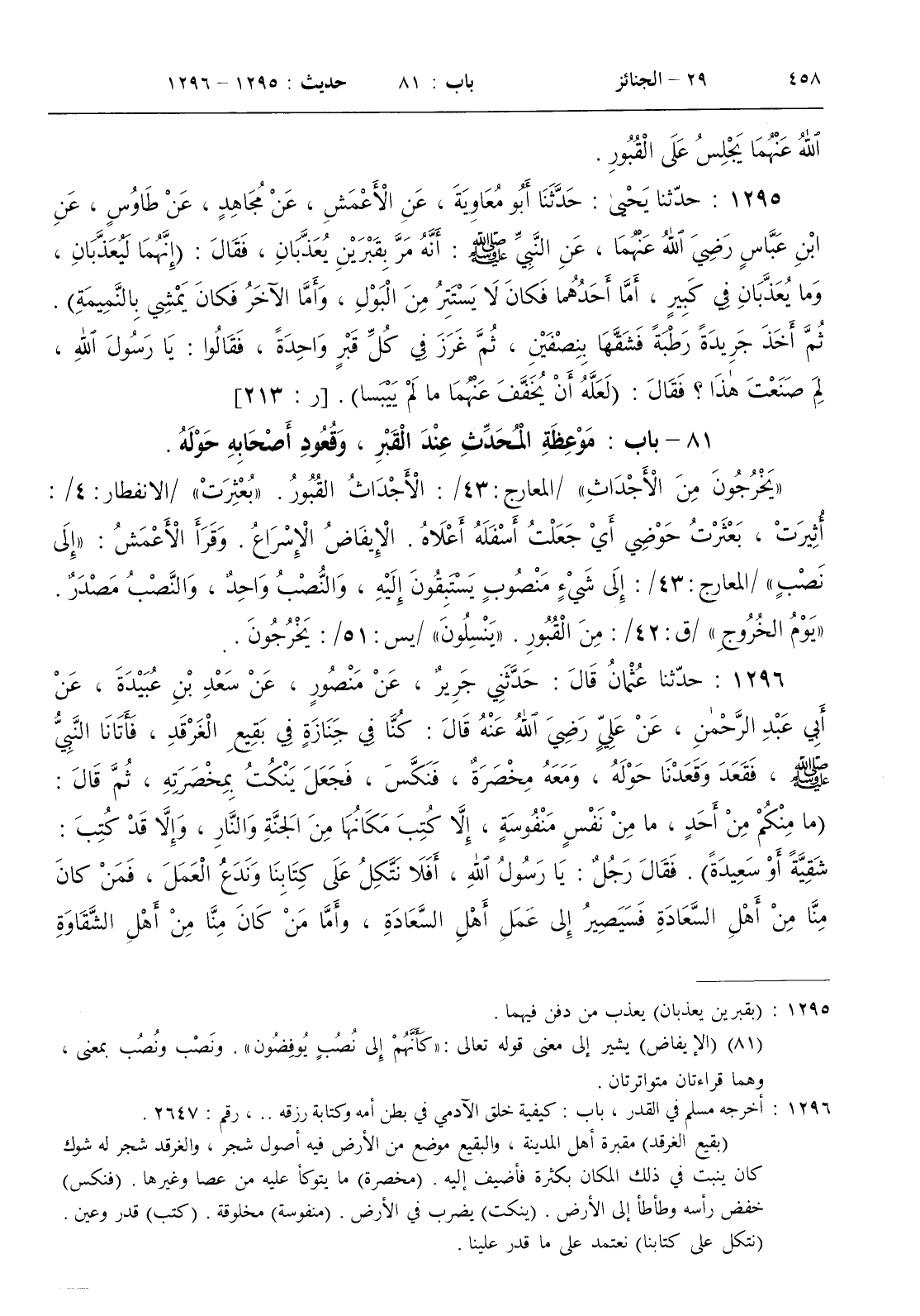 ( بقيع الغرقد ) مقبرة أهل المدينة والبقيع موضع من الأرض فيه أصول شجر والغرقد شجر له شوك كان ينبت في ذلك المكان بكثرة فأضيف إليه . ( مخصرة ) ما يتوكأ عليه من عصا وغيرها . ( فنكس ) خفض رأسه وطأطأ إلى الأرض . ( ينكت ) يضرب في الأرض . ( منفوسة ) مخلوقة . ( كتب ) قدر وعين . ( نتكل على كتابنا ) نعتمد على ما قدر علينا . ( أعطى واتقى ) أعطى الطاعة واتقى المعصية أي جاهد نفسه فبذل الطاعة واجتنب المعصية . ( الآية ) أي وما بعدها / الليل 5 - 10 / . وستأتي الآيات وشرحها في روايات الحديث