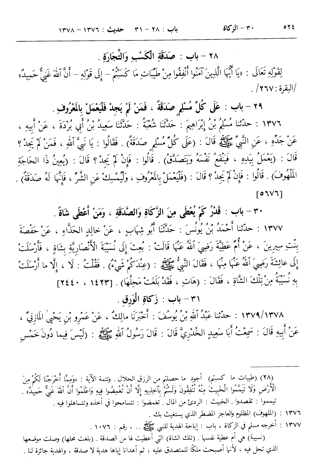 : عن النبي صلى الله عليه و سلم قال ( على كل مسلم صدقة ) . فقالوا يا نبي الله فمن لم يجد ؟ قال ( يعمل بيده فينفع نفسه ويتصدق ) . قالوا فإن لم يجد ؟ قال ( يعين ذا الحاجة الملهوف ) . قالوا فإن لم يجد ؟ قال ( فليعمل بالمعروف وليمسك عن الشر فإنها له صدقة )