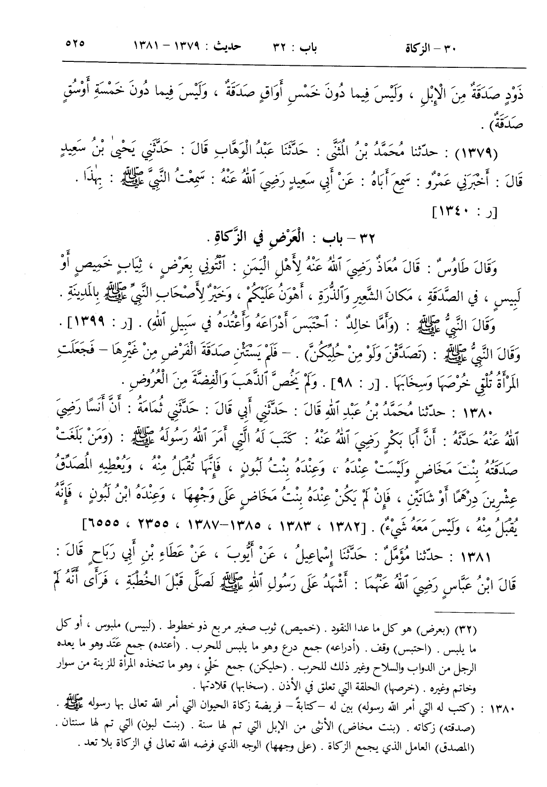 [ ش ( بعرض ) هو كل ما عدا النقود . ( خميص ) ثوب صغير مربع ذو خطوط . ( لبيس ) ملبوس أو كل ما يلبس . ( احتبس ) وقف . ( أدراعه ) جمع درع وهو ما يلبس للحرب . ( أعتده ) جمع عتد وهو ما يعده الرجل من الدواب والسلاح وغير ذلك للحرب . ( حليكن ) جمع حلي وهو ما تتخذه المرأة للزينة من سوار وخاتم وغيره . ( خرصها ) الحلقة التي تعلق في الأذن . ( سخابها ) قلادتها ]