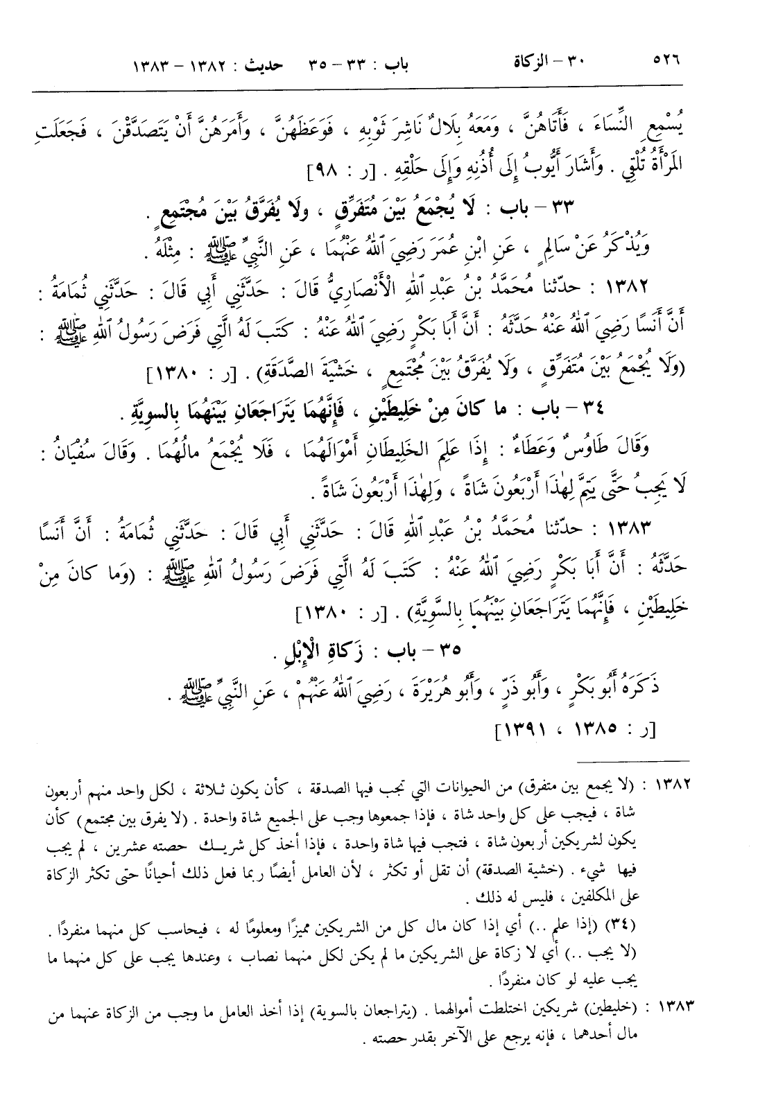 : أن أبا بكر رضي الله عنه كتب له التي فرض رسول الله صلى الله عليه و سلم ( ولا يجمع بين متفرق ولا يفرق بين مجتمع خشية الصدقة )