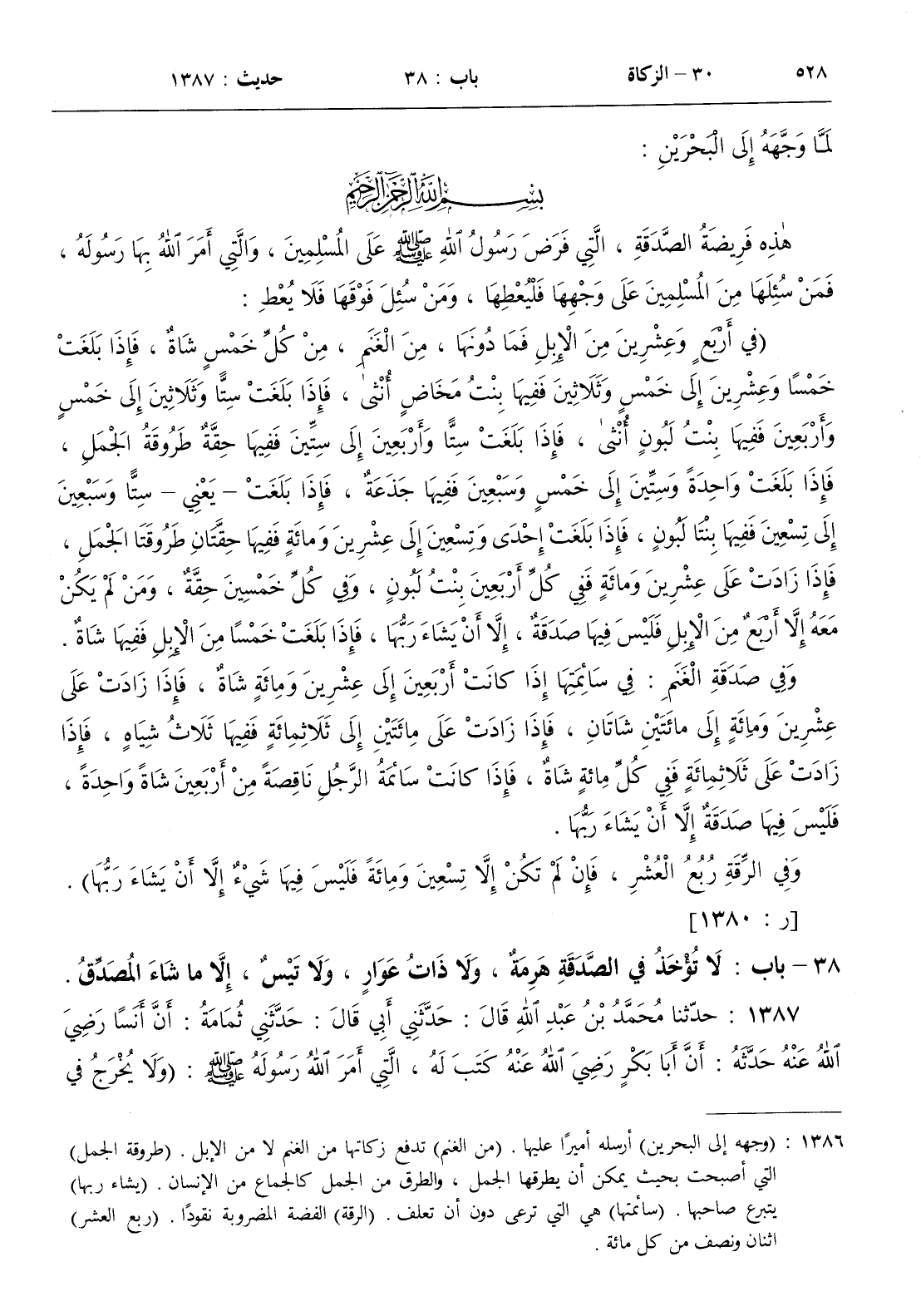 : أن أبا بكر رضي الله عنه كتب له التي أمر الله رسوله صلى الله عليه و سلم ( ولا يخرج في الصدقة هرمة ولا ذات عوار ولا تيس إلا ما شاء المصدق )