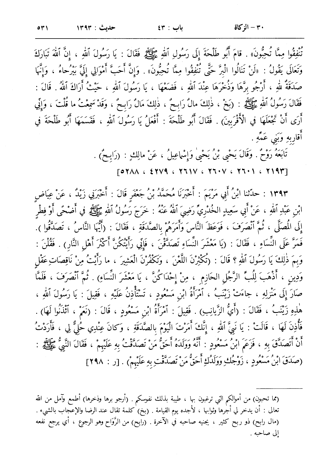 : خرج رسول الله صلى الله عليه و سلم في أضحى أو فطر إلى المصلى ثم انصرف فوعظ الناس وأمرهم بالصدقة فقال ( أيها الناس تصدقوا ) . فمر على النساء فقال ( يا معشر النساء تصدقن فإني رأيتكن أكثر أهل النار ) . فقلن وبم ذلك يا رسول الله ؟ قال ( تكثرن اللعن وتكفرن العشير ما رأيت من ناقصات عقل ودين أذهب للب الرجل الحازم من إحداكن يا معشر النساء ) . ثم انصرف فلما صار إلى منزله جاءت زينب امرأة ابن سعود تستأذن عليه فقيل يا رسول الله هذه زينب فقال ( أي الزيانب ) . فقيل امرأة ابن مسعود قال ( نعم ائذنوا لها ) . فإذن لها قالت يا نبي الله إنك أمرت اليوم بالصدقة وكان عندي حلي لي فأردت أن أتصدق به فزعم ابن مسعود أنه وولده أحق من تصدقت به عليهم فقال النبي صلى الله عليه و سلم ( صدق ابن مسعود زوجك وولدك أحق من تصدقت به عليهم )