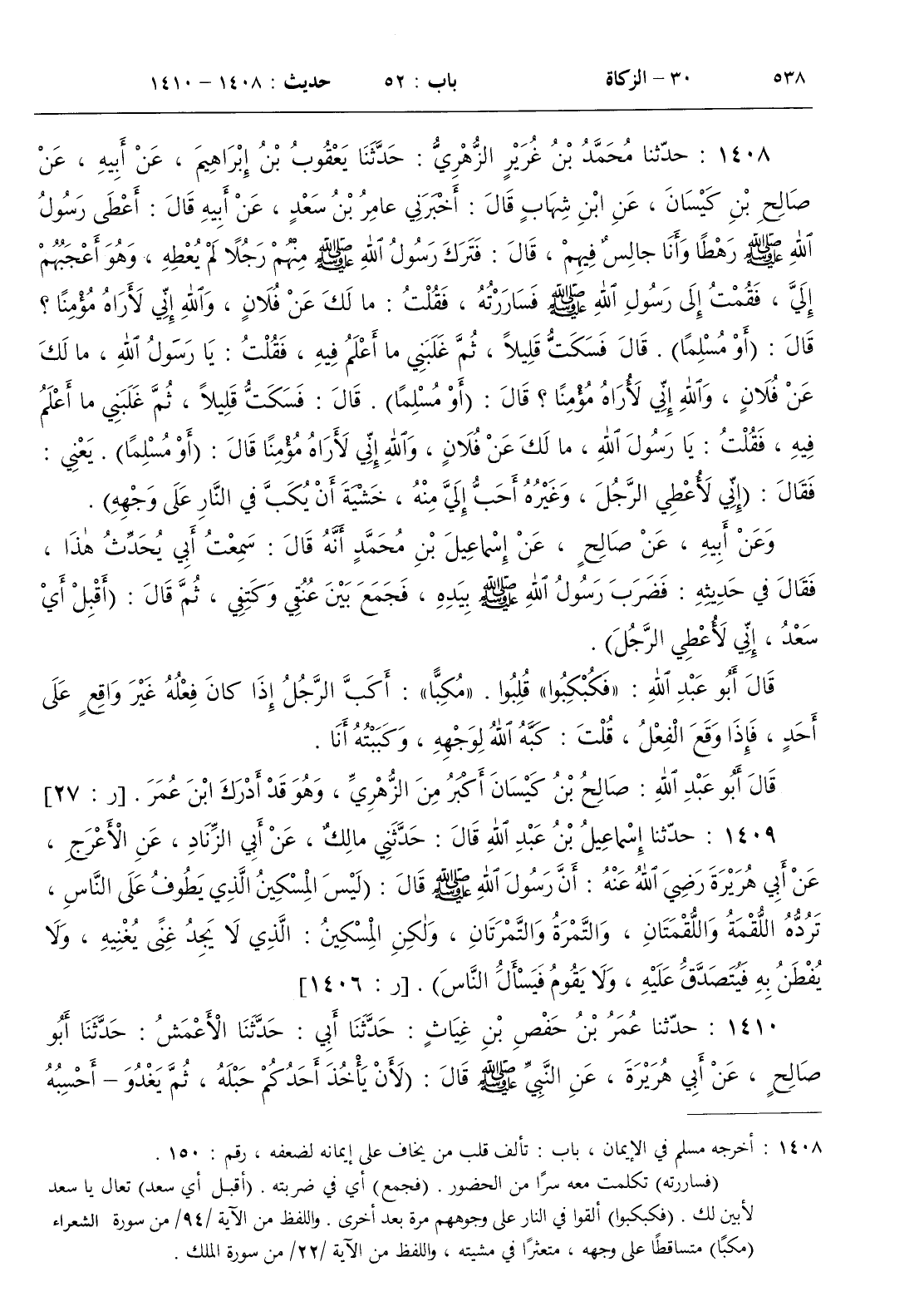 : أعطى رسول الله صلى الله عليه و سلم رهطا وأنا جالس فيهم قال فترك رسول الله صلى الله عليه و سلم منهم رجلا لم يعطه وهو أعجبهم إلي فقمت إلى رسول الله صلى الله عليه و سلم فساررته فقلت مالك عن فلان والله إني لأراه مؤمنا ؟ قال ( أو مسلما ) . قال فسكت قليلا ثم غلبني ما أعلم فيه فقلت يا رسول الله مالك عن فلان والله إني لأراه مؤمنا ؟ قال ( أو مسلما ) . قال فسكت قليلا ثم غلبني ما أعلم فيه فقلت يا رسول الله مالك عن فلان والله إني لأراه مؤمنا قال ( أو مسلما ) . يعني فقال ( إني لأعطي الرجل وغيره أحب إلي منه خشية أن يكب في النار على وجهه )