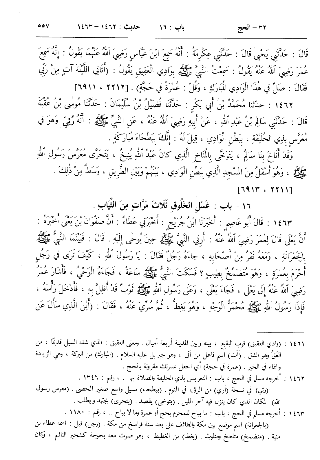 ( بالجعرانة ) اسم موضع بين مكة والطائف على بعد ستة فراسخ من مكة . ( رجل ) قيل اسمه عطاء بن منية . ( متضمخ ) متلطخ ومتلوث . ( يغط ) من الغطيط وهو صوت معه بحوحة كشخير النائم وكان يصيبه هذا من شدة الوحي وثقله . ( الجبة ) ثوب مخيط معروف . ( الإنقاء ) المبالغة في التنظيف ]