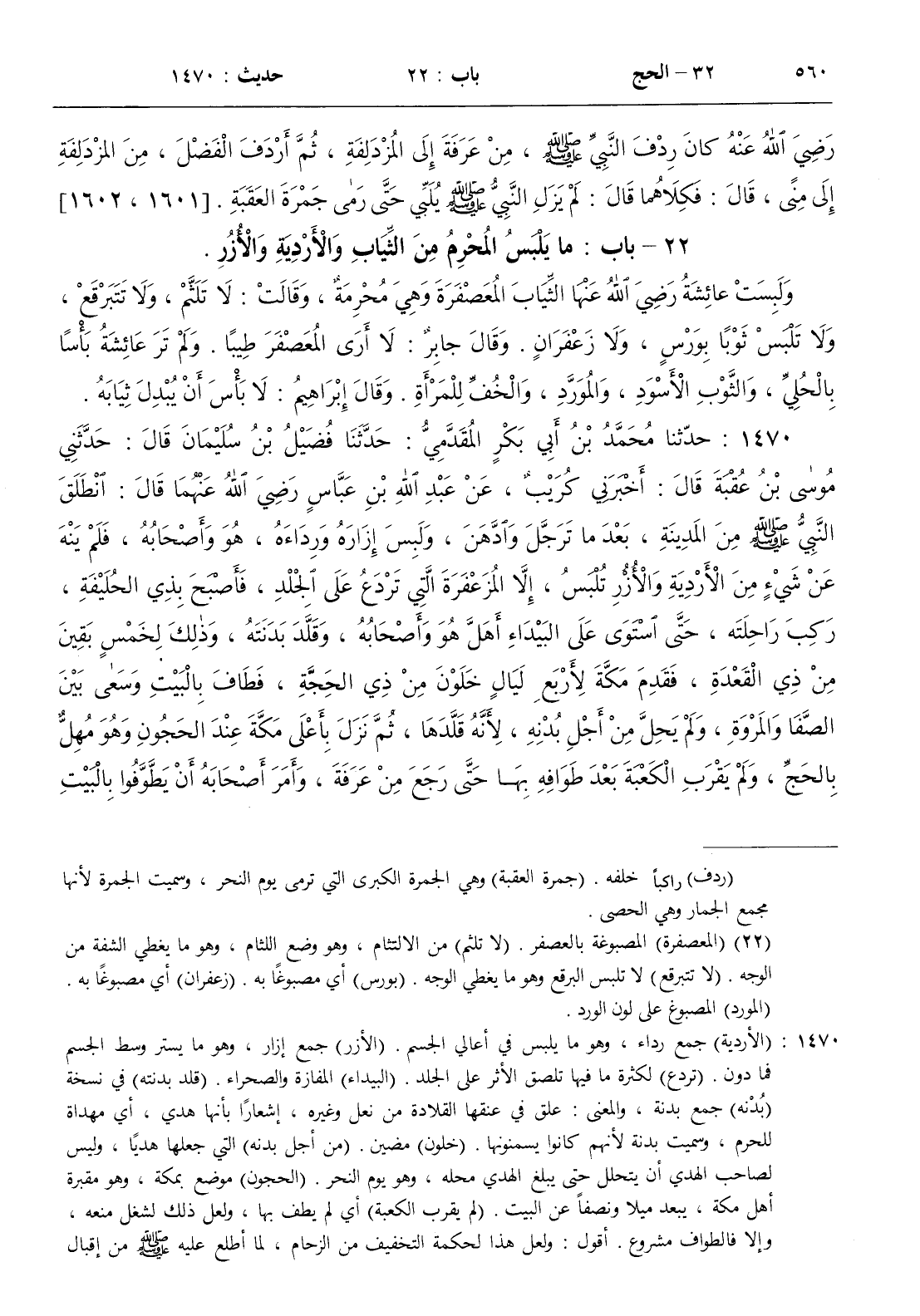 [ ش ( الأردية ) جمع رداء وهو ما يلبس في أعالي الجسم . ( الأزر ) جمع إزار وهو ما يستر وسط الجسم فما دون . ( تردع ) لكثرة ما فيها تلصق الأثر على الجلد . ( البيداء ) المفازة والصحراء . ( قلد بدنته ) في نسخة ( بدنه ) جمع بدنة والمعنى علق في عنقها القلادة من نعل وغيره إشعارا بأنها هدي أي مهداة للحرم وسميت بدنة لأنهم كانوا يسمنونها . ( خلون ) مضين . ( من أجل بدنه ) التي جعلها هديا وليس لصاحب الهدي أن يتحلل حتى يبلغ الهدي محله وهو يوم النحر . ( الحجون ) موضع بمكة وهو مقبرة أهل مكة يبعد ميلا ونصفا عن البيت . ( لم يقرب الكعبة ) أي لم يطف بها ولعل ذلك لشغل منعه وإلا فالطواف مشروع . أقول ولعل هذا لحكمة التخفيف من الزحام لما اطلع عليه صلى الله عليه و سلم من إقبال الحجيج وازدحامهم في مستقبل الزمان فلو أكثر الطواف مدة مقامه في مكة ىقتدى به المسلمون ولكان الحرج على الأمة ]