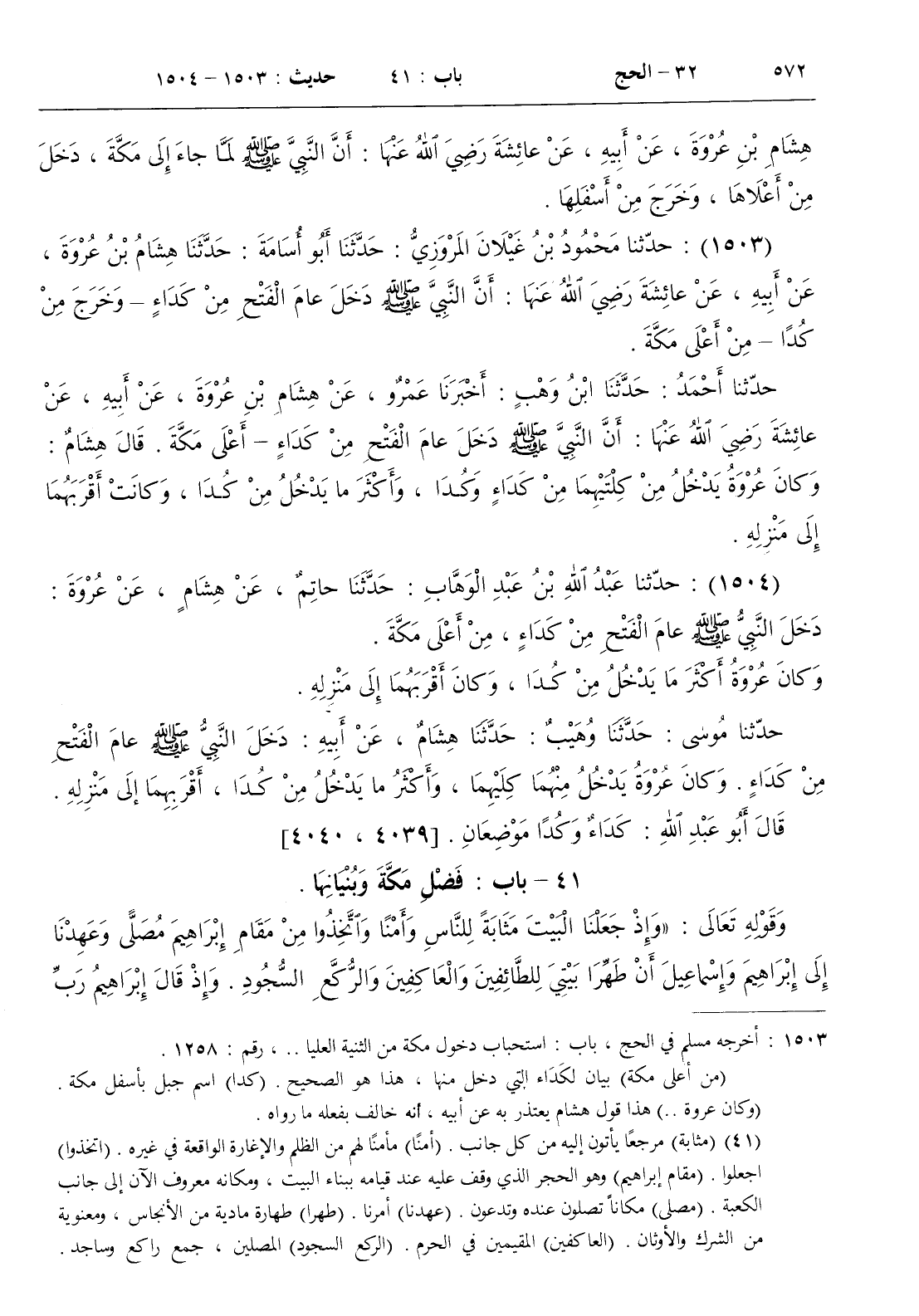 حدثنا موسى حدثنا وهيب حدثنا هشام عن أبيه دخل النبي صلى الله عليه و سلم عام الفتح من كداء . وكان عروة يدخل منهما كليهما وأكثر ما يدخل من كدا أقربهما إلى منزله