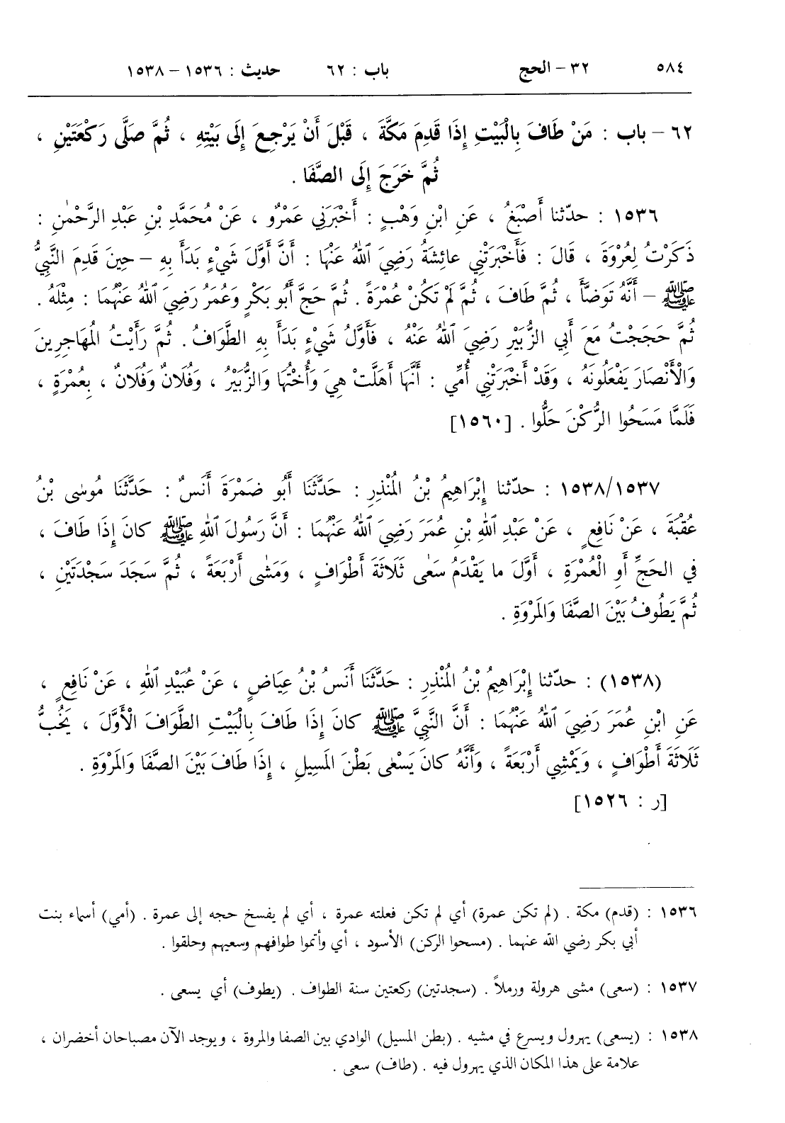 [ ش ( يسعى ) يهرول ويسرع في مشيه . ( بطن المسيل ) الوادي بين الصفا والمروة ويوجد الآن مصباحان أخضران علامة على هذا المكان الذي يهرول فيه . ( طاف ) سعى ]