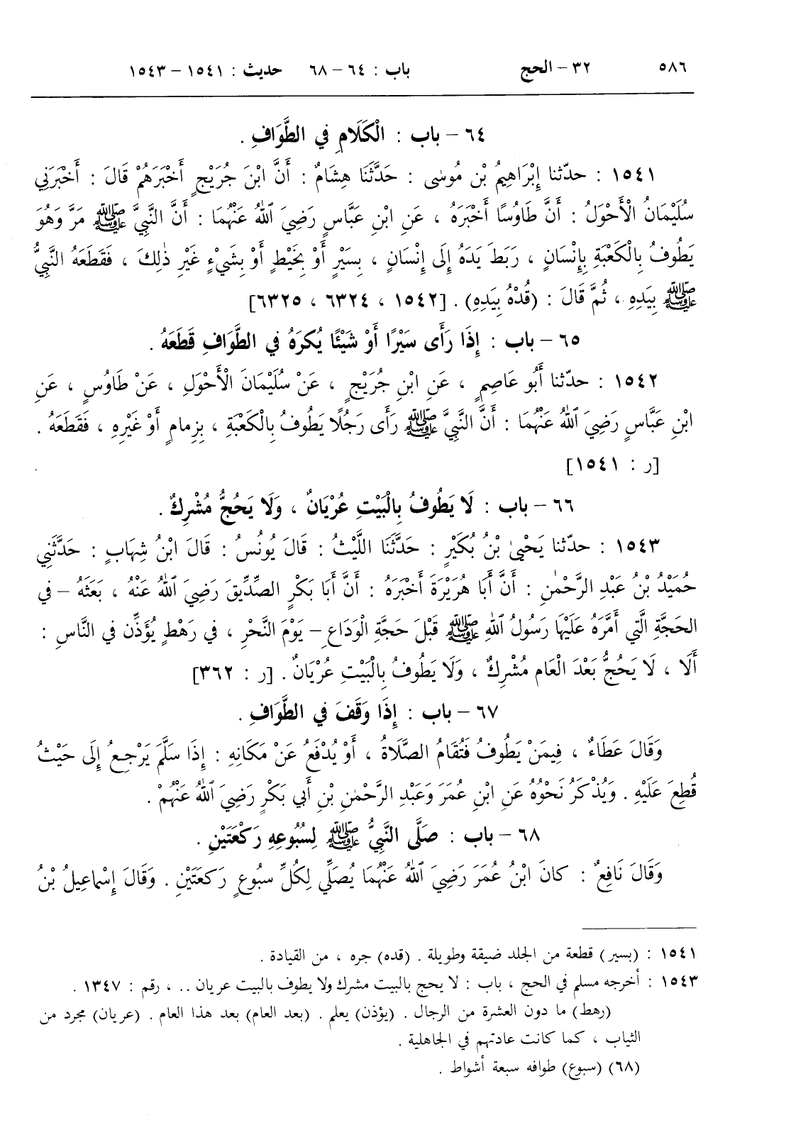 : أن النبي صلى الله عليه و سلم رأى رجلا يطوف بالكعبة بزمام أو غيره فقطعه