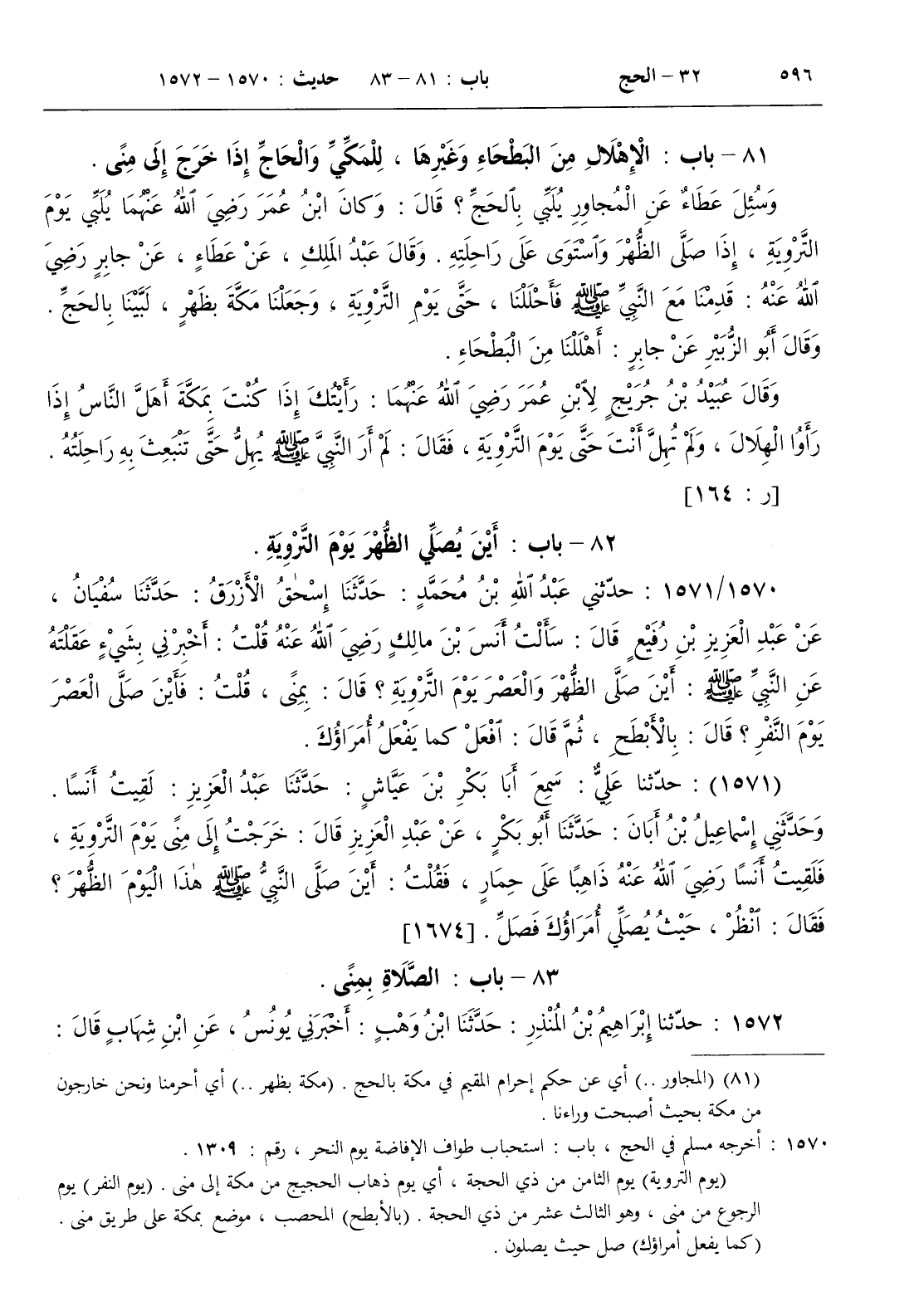 : خرجت إلى منى يوم التروية فلقيت أنسا رضي الله عنه ذاهبا على حمار فقلت أين صلى النبي صلى الله عليه و سلم هذا اليوم الظهر ؟ فقال انظر حيث يصلي أمراؤك فصل