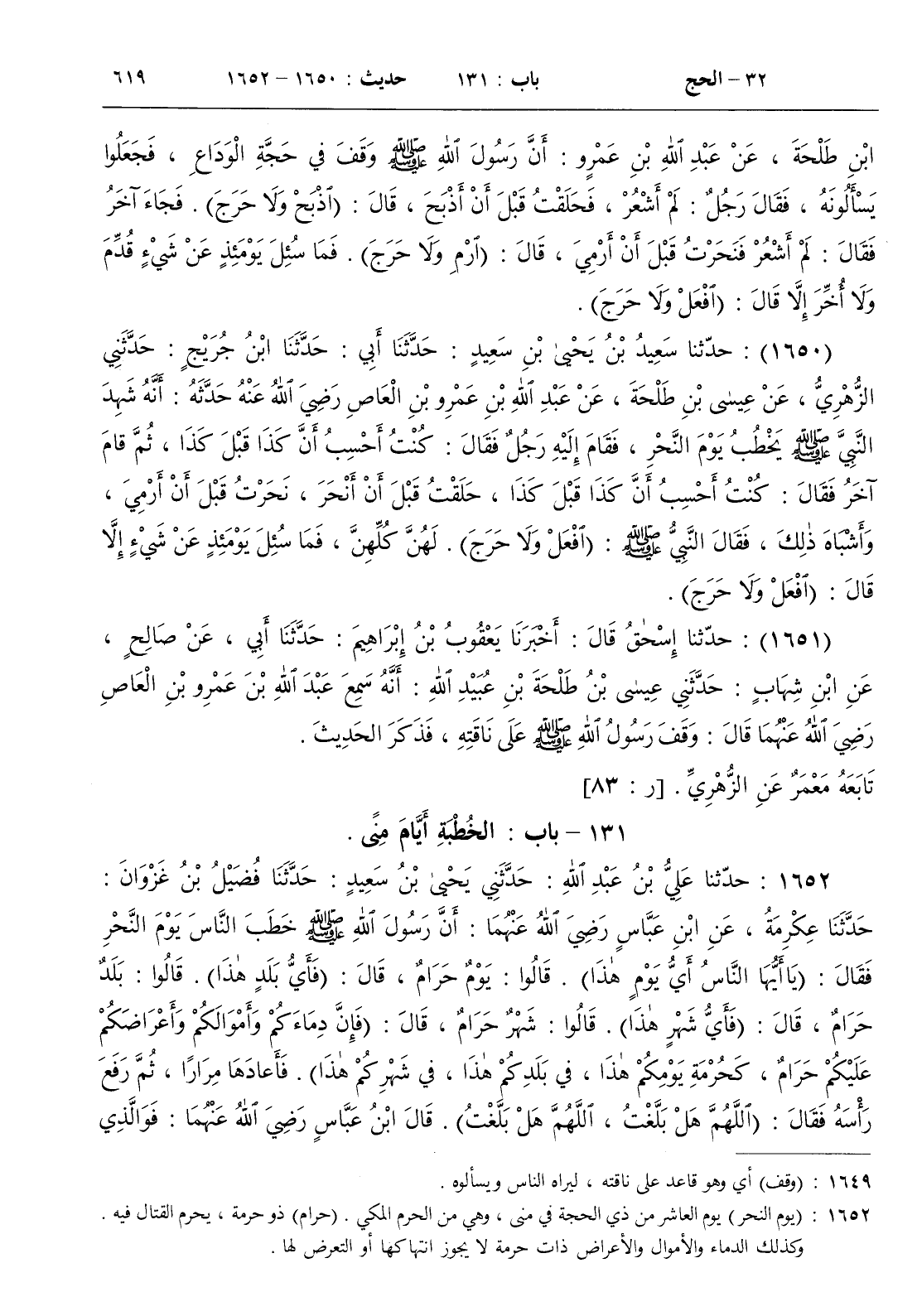 1651 - حدثنا إسحق قال أخبرنا يعقوب بن إبراهيم حدثنا أبي عن صالح عن ابن شهاب حدثني عيسى بن طلحة بن عبيد الله أنه سمع عبد الله بن عمرو بن العاص رضي الله عنهما قال وقف رسول الله صلى الله عليه و سلم على ناقته فذكر الحديث