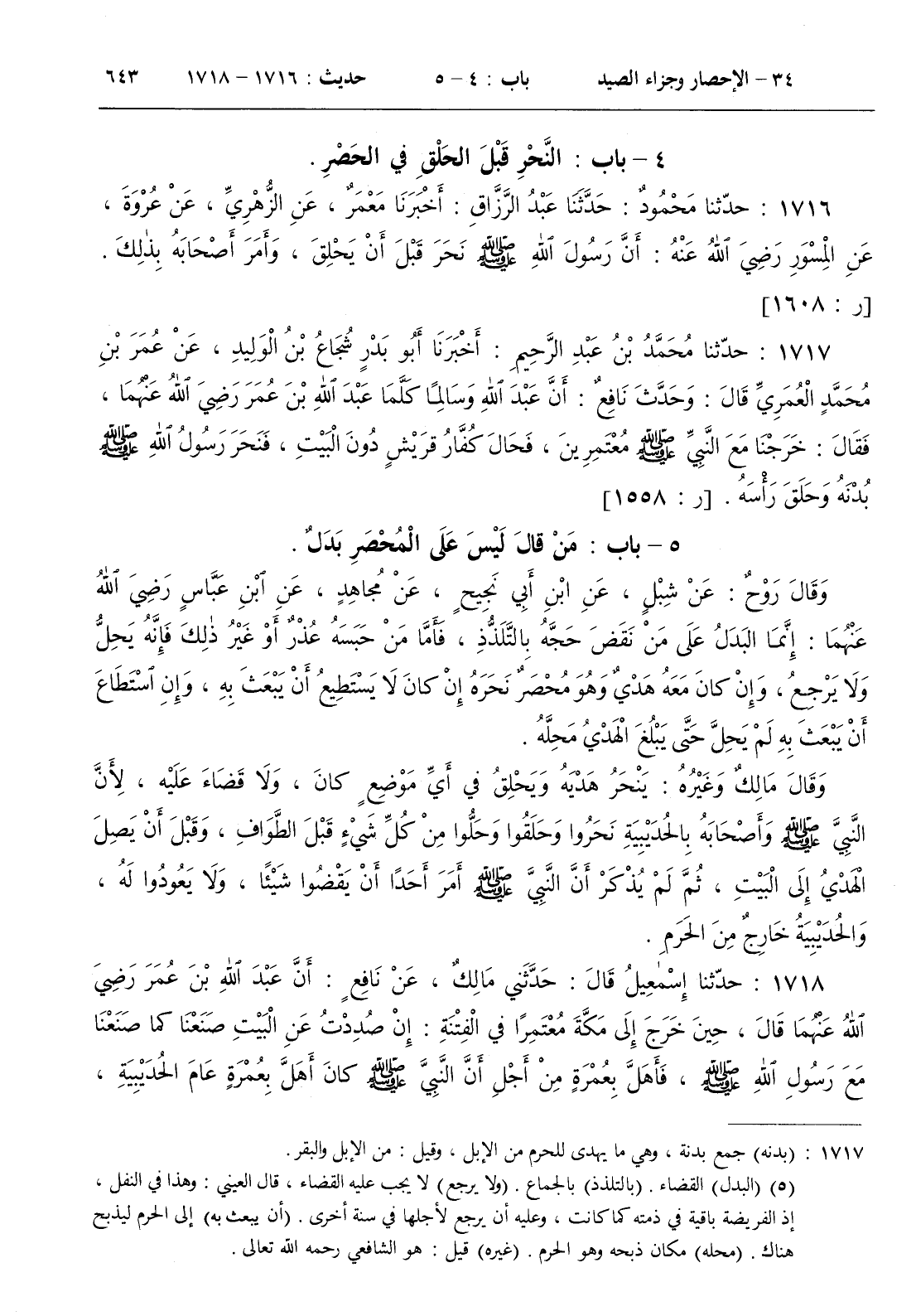 1718 - حدثنا إسماعيل قال حدثني مالك عن نافع أن عبد الله ابن عمر رضي الله عنهما قال حين خرج إلى مكة معتمرا في الفتنة إن صددت عن البيت صنعنا كما صنعنا مع رسول الله صلى الله عليه و سلم فأهل بعمرة من أجل أن النبي صلى الله عليه و سلم كان أهل بعمرة عام الحديبية ثم إن عبد الله بن عمر نظر في أمره فقال ما أمرهما إلا واحد فالتفت إلى أصحابه فقال ما أمرهما إلا واحد أشهدكم أني قد أوجبت الحج مع العمرة ثم طاف لهما طوافا واحدا ورأى أن ذلك مجزيا عنه وأهدى