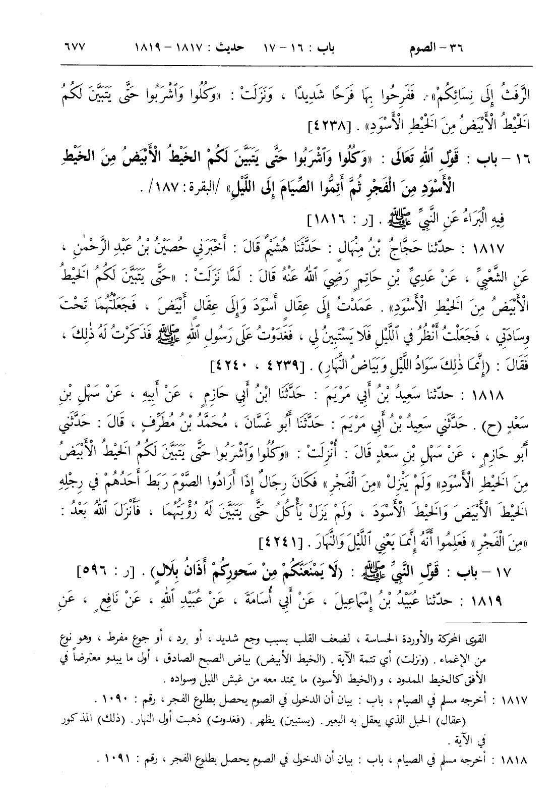 : لما نزلت { حتى يتبين لكم الخيط الأبيض من الخيط الأسود } . عمدت إلى عقال أسود وإلى عقال أبيض فجعلتهما تحت وسادتي فجعلت أنظر في الليل فلا يستبين لي فغدوت على رسول الله صلى الله عليه و سلم فذكرت له ذلك فقال ( إنما ذلك سواد الليل وبياض النهار )