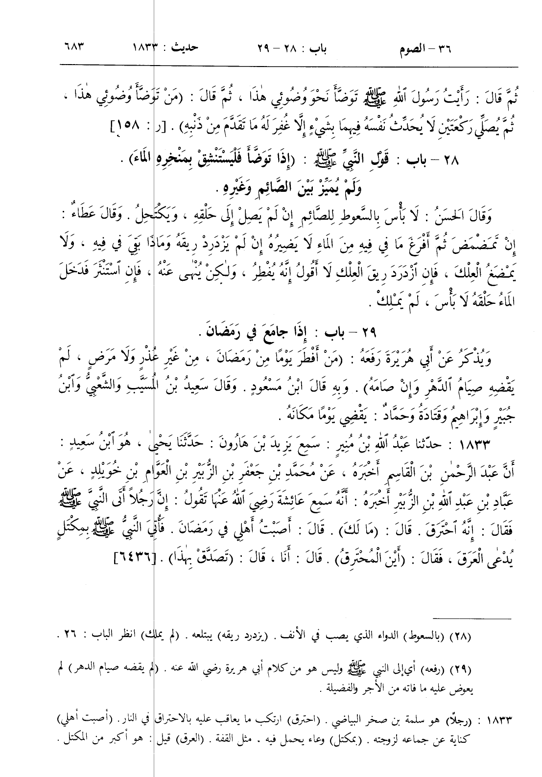 : إن رجلا أتى النبي صلى الله عليه و سلم فقال إنه احترق . قال ( مالك ) . قال أصبت أهلي في رمضان . فأتي النبي صلى الله عليه و سلم بمكتل يدعى العرق فقال ( أين المحترق ) . قال أنا قال ( تصدق بهذا )