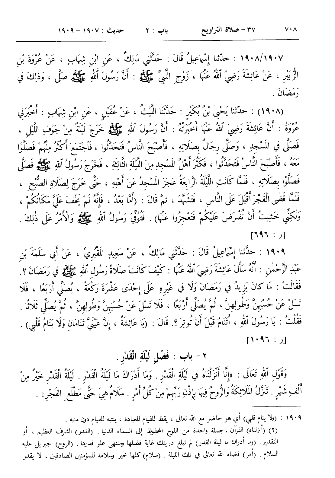 : أنه سأل عائشة رضي الله عنها كيف كانت صلاة رسول الله صلى الله عليه و سلم في رمضان ؟ . فقالت ما كان يزيد في رمضان ولا في غيره على إحدى عشرة ركعة يصلي أربعا فلا تسل عن حسنهن وطولهن ثم يصلي أربعا فلا تسل عن حسنهن وطولهن ثم يصلي ثلاثا . فقلت يا رسول الله أتنام قبل أن توتر ؟ . قال ( يا عائشة إن عيني تنامان ولا ينام قلبي )