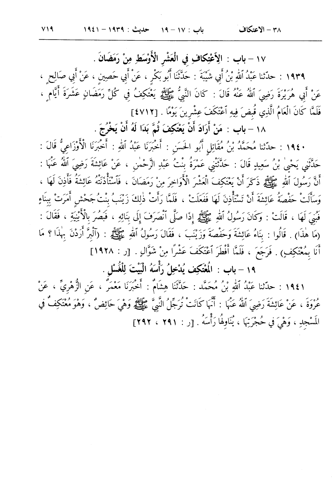 19 - باب المعتكف يدخل رأسه البيت للغسل