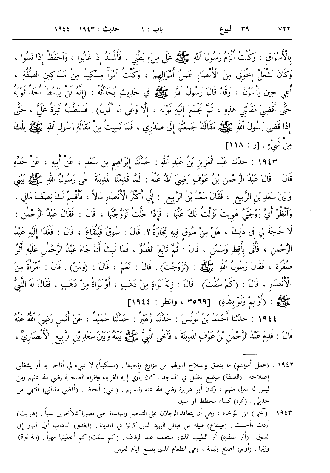 [ ش ( آخى ) من المؤاخاة وهي أن يتعاقد الرجلان على التناصر والمواساة حتى يصيرا كالأخوين نسبا . ( هويت ) أردت وأحببت . ( قينقاع ) قبيلة من قبائل اليهود الذين كانوا في المدينة . ( الغدو ) الذهاب أول النهار إلى السوق . ( أثر صفرة ) أثر الطيب الذي استعمله عند الزفاف . ( كم سقت ) كم أعطيتها مهرا . ( زنة نواة ) وزنها . ( أولم ) اصنع وليمة وهي الطعام الذي يصنع أيام العرس ]