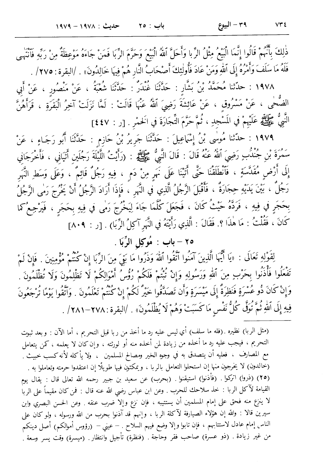 [ ش ( ذروا ) اتركوا . ( فأذنوا ) استيقنوا . ( بحرب ) عن سعيد بن جبير رحمه الله تعالى قال يقال يوم القيامة لآكل الربا خذ سلاحك للحرب . وعن ابن عباس رضي الله عنه قال فمن كان مقيما على الربا لا ينزع منه فحق على إمام المسلمين أن يستتيبه فإن نزع وإلا ضرب عنقه . وعن الحسن البصري وابن سيرين قالا والله إن هؤلاء الصيارفة لآكلة الربا وإنهم قد آذنوا بحرب من الله ورسوله ولو كان على الناس إمام عادل لاستتابهم فإن تابوا وإلا وضع فيهم السلاح . - عيني - ( رؤوس أموالكم ) أصل دينكم من غير زيادة . ( ذو عسرة ) صاحب فقر وحاجة . ( فنظرة ) تأجيل وانتظار . ( ميسرة ) وقت يسر وسعة ]