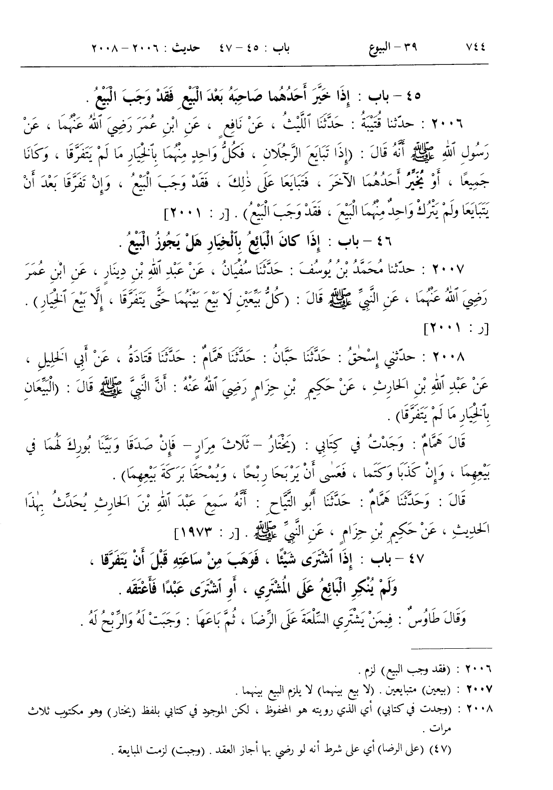 2006 - حدثنا قتيبة حدثنا الليث عن نافع عن ابن عمر رضي الله عنهما عن رسول الله صلى الله عليه و سلم أنه قال ( إذا تبايع الرجلان فكل واحد منهما بالخيار ما لم يتفرقا وكانا جميعا أو يخير أحدهما الآخر فتبايعا على ذلك فقد وجب البيع وإن تفرقا بعد أن يتبايعا ولم يترك واحد منهما البيع فقد وجب البيع )