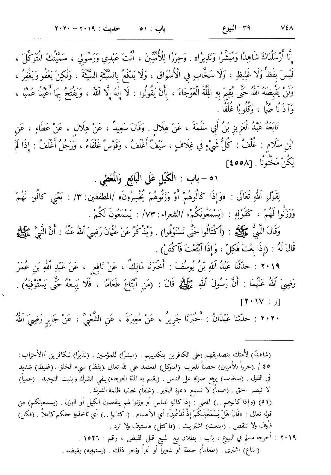 ( ابتاع ) اشترى . ( طعاما ) حنطة أو شعيرا أو تمرا ونحو ذلك . ( يستوفيه ) يقبضه ]