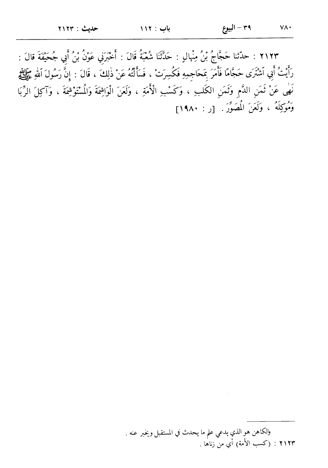 2123 - حدثنا حجاج بن منهال حدثنا شعبة قال أخبرني عون بن أبي جحيفة قال رأيت أبي اشترى حجاما فأمر بمحاجمه فكسرت فسألته عن ذلك قال إن رسول الله صلى الله عليه و سلم نهى عن ثمن الدم وثمن الكلب وكسب الأمة ولعن الواشمة والمستوشمة وآكل الربا وموكله ولعن المصور