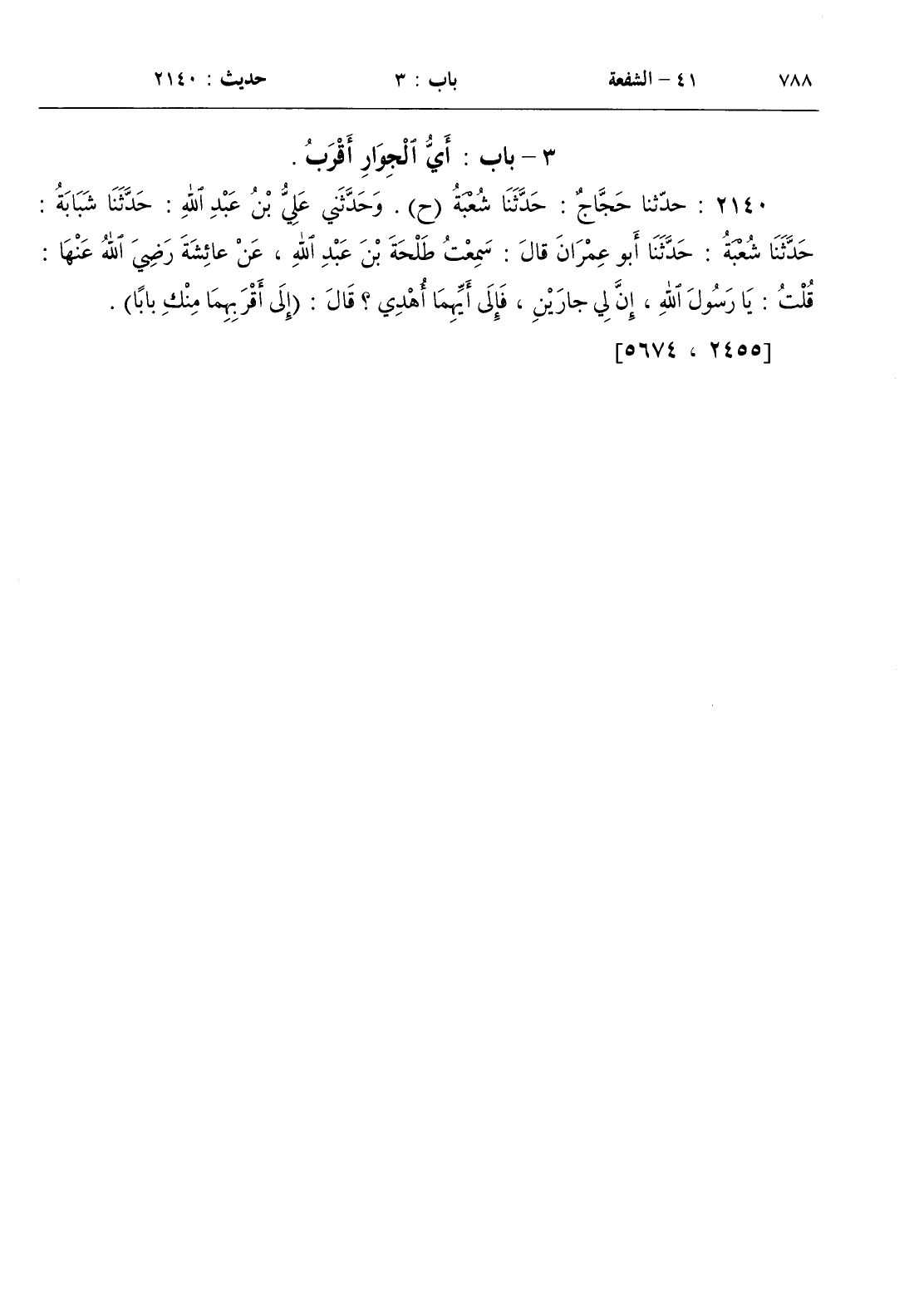 2140 - حدثنا حجاج حدثنا شعبة ( ح ) . وحدثني علي بن عبد الله حدثنا شبابة حدثنا شعبة حدثنا أبو عمران قال سمعت طلحة بن عبد الله عن عائشة رضي الله عنها