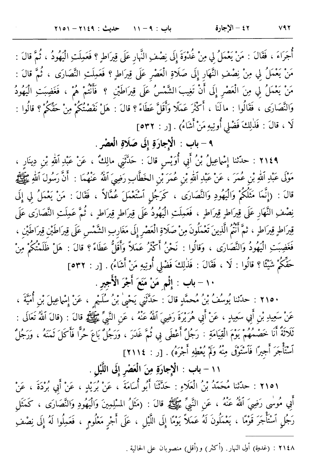 : عن النبي صلى الله عليه و سلم قال ( مثل المسلمين واليهود والنصارى كمثل رجل استأجر قوما يعملون له عملا يوما إلى الليل على أجر معلوم فعملوا له إلى نصف النهار فقالوا لا حاجة لنا إلى أجرك الذي شرطت لنا وما عملنا باطل فقال لهم لا تفعلوا أكملوا بقية عملكم وخذوا أجركم كاملا فأبوا وتركوا واستأجر أجيرين بعدهم فقال لهما أكملا بقية يومكما هذا ولكما الذي شرطت لهم من الأجر فعملوا حتى إذا كان حين صلاة العصر قالا لك ما عملنا باطل ولك الأجر الذي جعلت لنا فيه . فقال لهما أكملا بقية عملكما ما بقي من النهار شيء يسير فأبيا واستأجر قوما أن يعملوا له بقية يومهم فعملوا بقية يومهم حتى غابت الشمس واستكملوا أجر الفريقين كليهما فذلك مثلهم ومثل ما قبلوا من هذا النور )