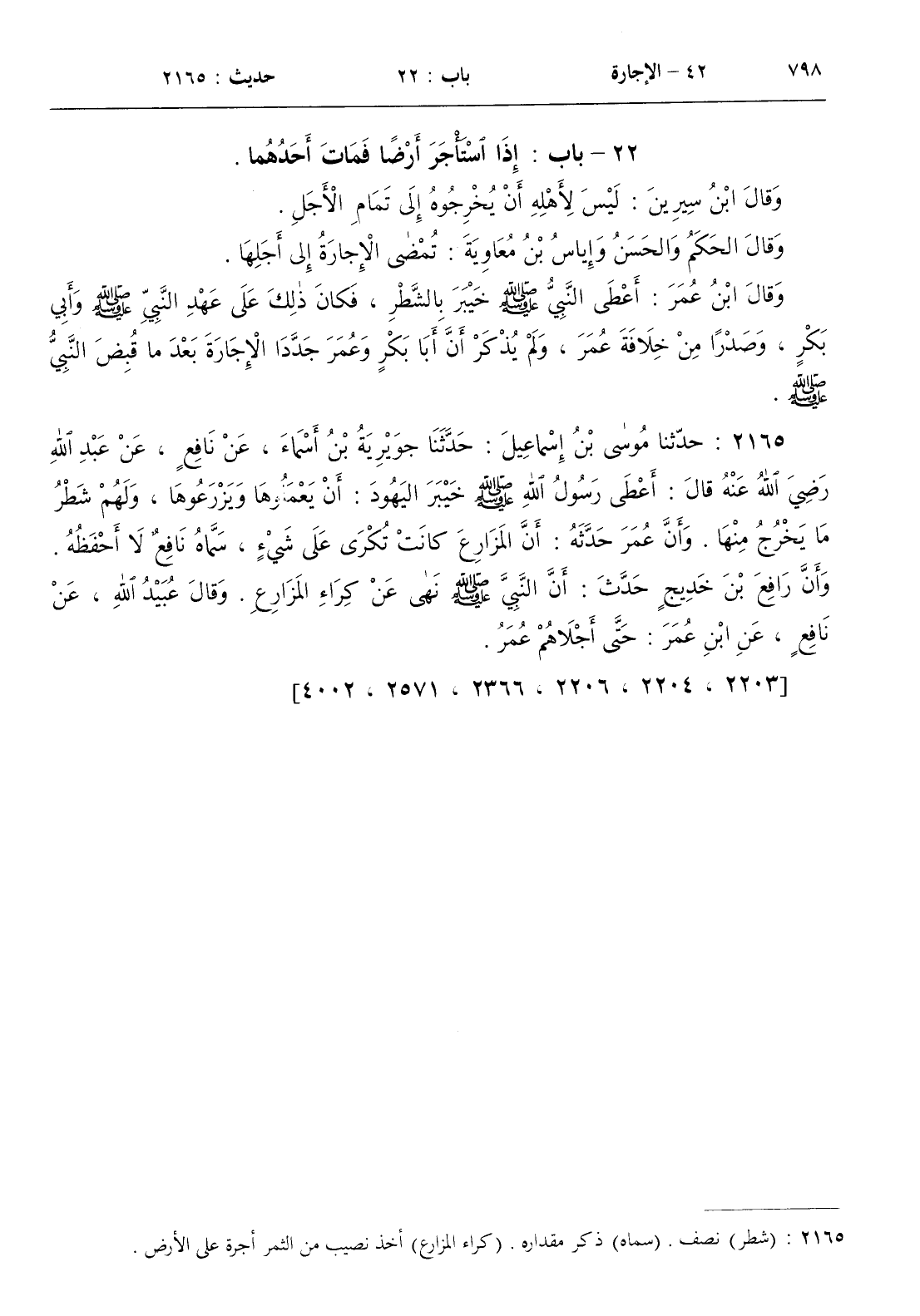 : أعطى رسول الله صلى الله عليه و سلم خيبر لليهود أن يعملوها ويزرعوها ولهم شطر ما يخرج منها . وأن عمر حدثه أن المزارع كانت تكرى على شيء سماه نافع لا أحفظه . وأن رافع بن خديج حدث أن النبي صلى الله عليه و سلم نهى عن كراء المزارع . وقال عبيد الله عن نافع عن ابن عمر حتى أجلاهم عمر
