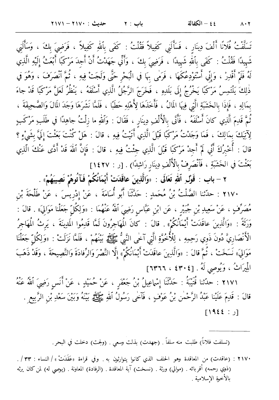 [ ش ( عادت ) من المعاقدة وهو الحلف الذي كانوا يتوارثون به . وفي قراءة { عقدت } / النساء 33 / . ( ذوي رحمه ) أقربائه . ( موالي ) ورثة . ( نسخت ) آية المعاقدة . ( الرفادة ) المعاونة . ( يوصي له ) لمن كان يرثه بالأخوة الإسلامية ]