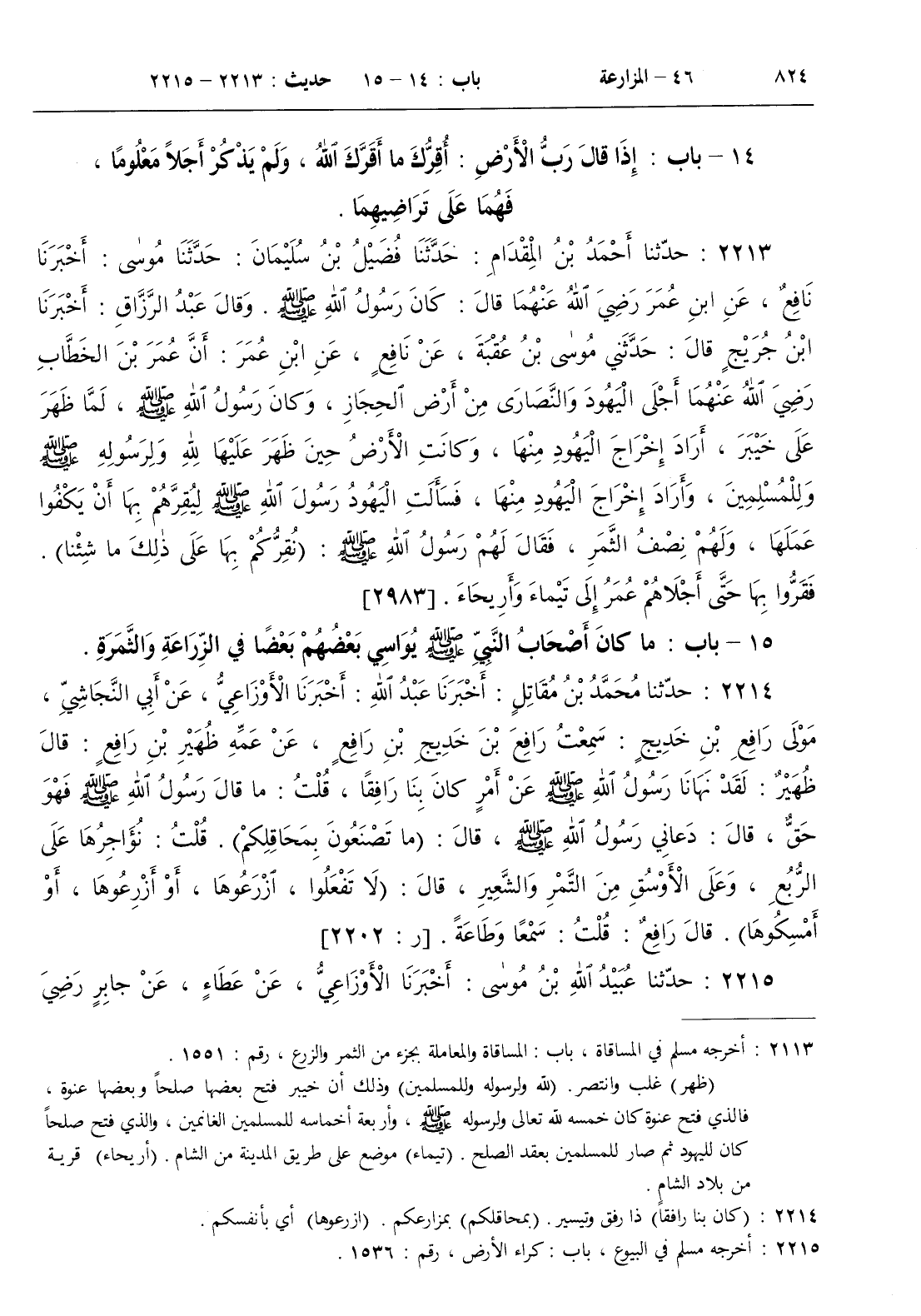 15 - باب ما كان أصحاب النبي صلى الله عليه و سلم يواسي بعضهم بعضا في الزراعة والثمرة
