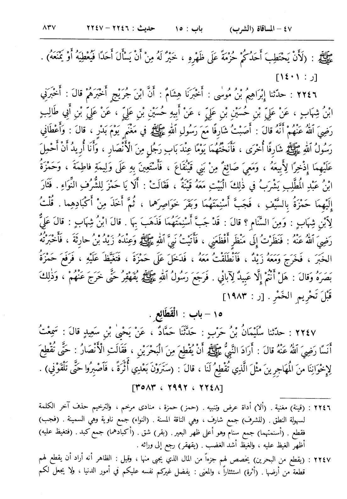 : أصبت شارفا مع رسول الله صلى الله عليه و سلم في مغنم يوم بدر قال وأعطاني رسول الله صلى الله عليه و سلم شارفا أخرى فأنختهما يوما عند باب رجل من الأنصار وأنا أريد أن أحمل عليهما إذخرا لأبيعه ومعي صائغ من بني قينقاع فأستعين به على وليمة فاطمة وحمزة بن عبد المطلب يشرب في ذلك البيت معه قينة فقالت ألا يا حمز للشرف النواء . فثار إليهما حمزة بالسيف فجب أسنمتهما وبقر خواصرهما ثم أخذ من أكبادهما . قلت لابن شهاب ومن السنام ؟ قال قد جب أسنمتهما فذهب بها . قال ابن شهاب قال علي رضي الله عنه فنظرت إلى منظر أفظعني فأتيت نبي الله صلى الله عليه و سلم وعنده زيد بن حارثة فأخبرته الخبر فخرج ومعه زيد فانطلقت معه فدخل على حمزة فتغيظ عليه فرفع حمزة بصره وقال هل أنتم إلا عبيد لآبائي . فرجع رسول الله صلى الله عليه و سلم يقهقر حتى خرج عنهم وذلك قبل تحريم الخمر