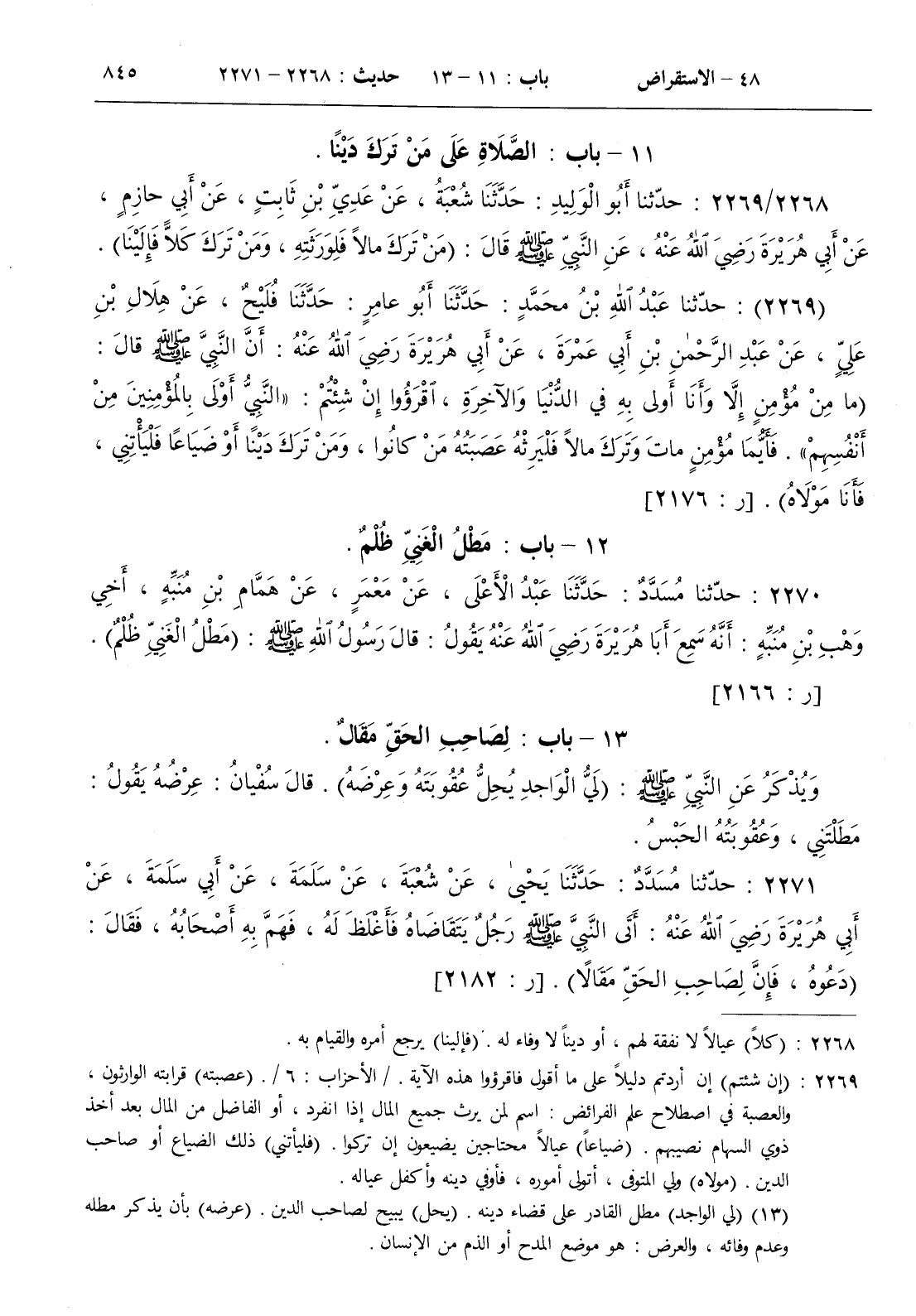 [ ش ( إن شئتم ) إن أردتم دليلا على ما أقول فاقرؤوا هذه الآية . / الأحزاب 6 / . ( عصبته ) قرابته الوارثون والعصبة في اصطلاح علم الفرائض اسم لمن يرث جميع المال إذا انفرد أو الفاضل من المال بعد أخذ ذوي السهام نصيبهم . ( ضياعا ) عيالا محتاجين يضيعون إن تركوا . ( فليأتني ) ذلك الضياع أو صاحب الدين . ( مولاه ) ولي المتوفى أتولى أموره فأوفي دينه وأكفل عياله ]