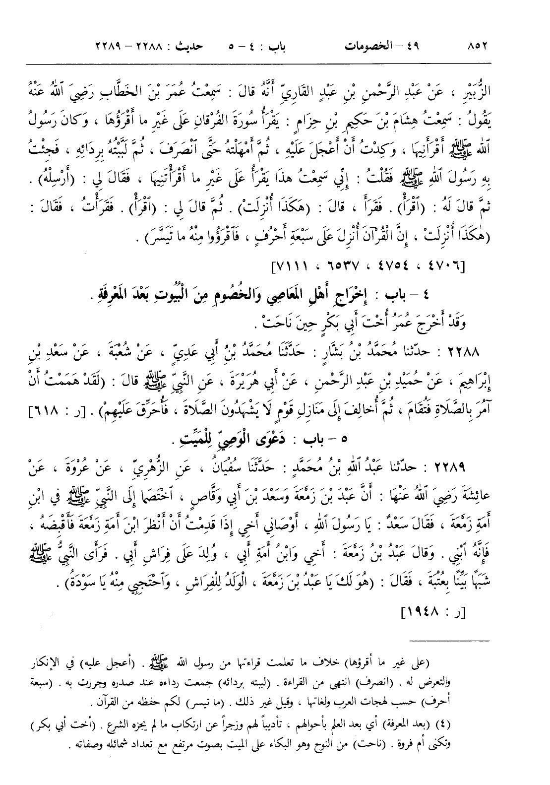 : أن عبد بن زمعة وسعد بن أبي وقاص اختصما إلى النبي صلى الله عليه و سلم في ابن أمة زمعة فقال سعد يا رسول الله أوصاني أخي إذا قدمت أن أنظر ابن أمة زمعة فأقبضه فإنه ابني وقال عبد بن زمعة وأخي وابن أمة أبي ولد على فراش أبي . فرأى النبي صلى الله عليه و سلم شبها بينا بعتبة فقال ( هو لك يا عبد بن زمعة الولد للفراش واحتجبي منه يا سودة )