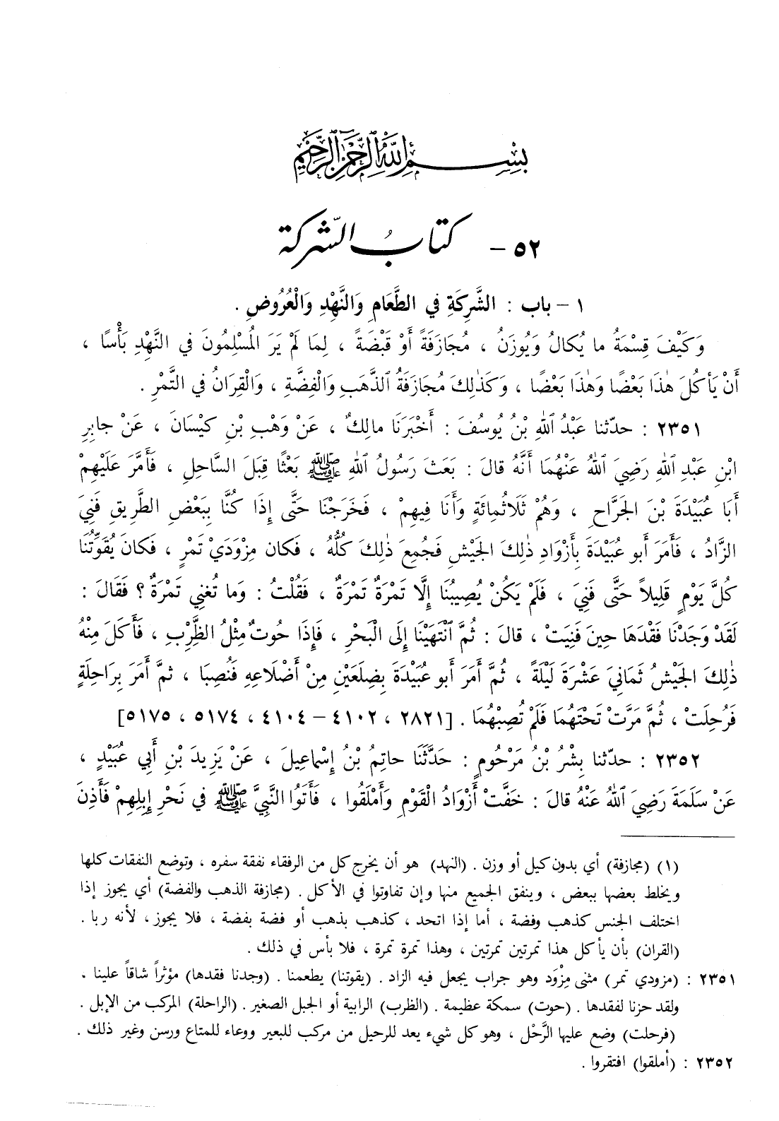 [ ش ( مزودي تمر ) مثنى مزود وهو جراب يجعل فيه الزاد . ( يقوتنا ) يطعمنا . ( وجدنا فقدها ) مؤثرا شاقا علينا ولقد حزنا لفقدها . ( حوت ) سمكة عظيمة . ( الظرب ) الرابية أو الجبل الصغير . ( الراحلة ) المركب من الإبل . ( فرحلت ) وضع عليها الرحل وهو كل شيء يعد للرحيل من مركب للبعير ووعاء للمتاع ورسن وغير ذلك ]