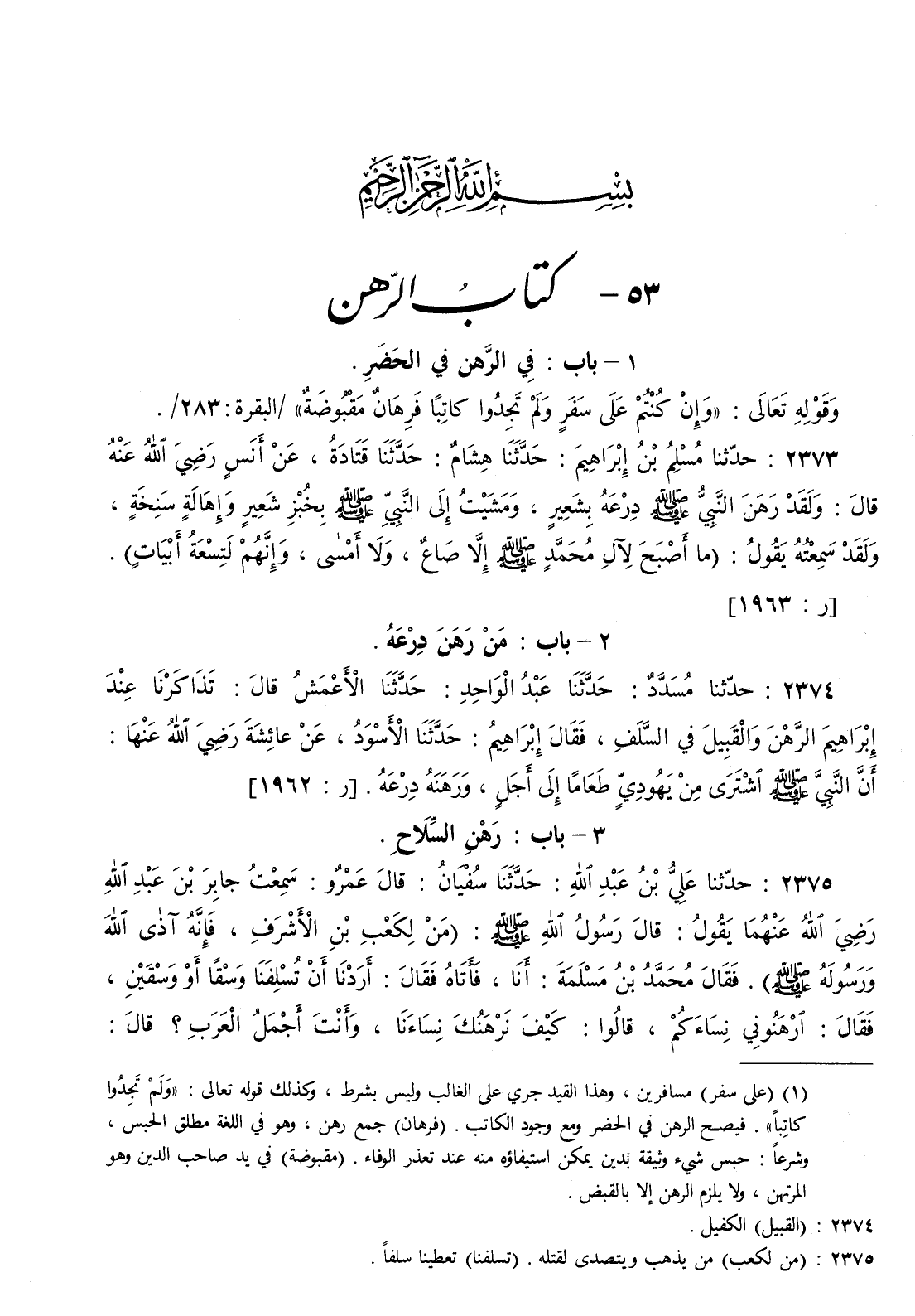 2374 - حدثنا مسدد حدثنا عبد الواحد حدثنا الأعمش قال تذاكرنا عند إبراهيم الرهن والقبيل في السلف فقال إبراهيم حدثنا الأسود عن عائشة رضي الله عنها