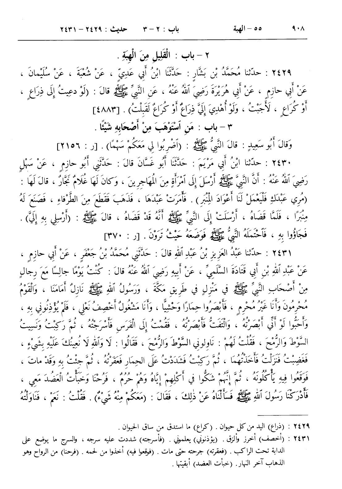 [ ش ( أخصف ) أخرز وألزق . ( يؤذنوني ) يعلموني . ( فأسرجته ) شددت عليه سرجه والسرج ما يوضع على الدابة تحت الراكب . ( فعقرته ) جرحته حتى مات . ( فوقعوا فيه ) أخذوا من لحمه . ( فرحنا ) من الرواح وهو الذهاب آخر النهار . ( خبأت العضد ) أبقيتها . ( نفدها ) أتى عليها كلها ولم يبق منها شيئا ]