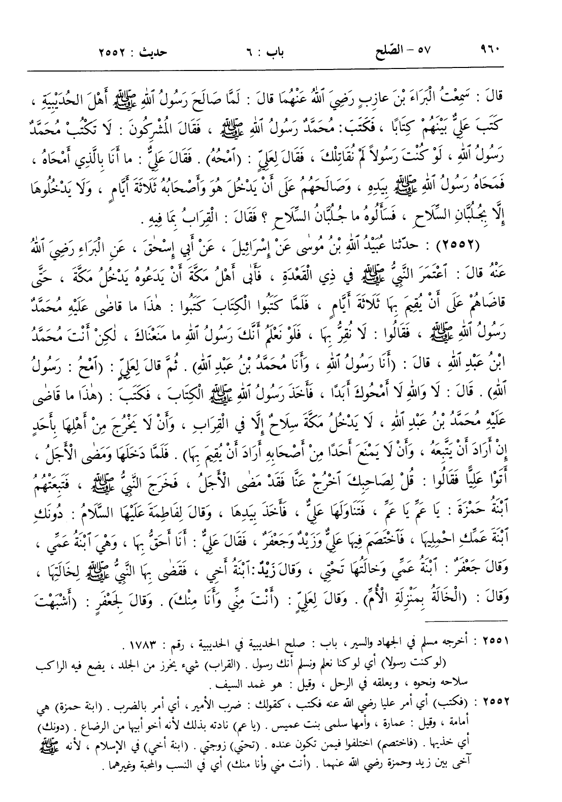 : اعتمر النبي صلى الله عليه و سلم في ذي القعدة فأبى أهل مكة أن يدعوه يدخل مكة حتى قاضاهم على أن يقيم بها ثلاثة أيام فلما كتبوا الكتاب كتبوا هذا ما قاضى عليه محمد رسول الله صلى الله عليه و سلم فقالوا لا نقر بها فلو نعلم أنك رسول الله ما منعاك لكن أنت محمد بن عبد الله قال ( أنا رسول الله وأنا محمد بن عبد الله ) . ثم قال لعلي ( امح رسول الله ) . قال لا والله لا أمحوك أبدا فأخذ رسول الله صلى الله عليه و سلم الكتاب فكتب ( هذا ما قاضى عليه محمد بن عبد الله لا يدخل مكة سلاح إلا في القراب وأن لا يخرج من أهلها بأحد إن أراد أن يتبعه وأن لا يمنع أحدا من أصحابه أراد أن يقيم بها ) . فلما دخلها ومضى الأجل أتوا عليا فقالوا قل لصاحبك اخرج عنا فقد مضى الأجل فخرج النبي صلى الله عليه و سلم فتبعتهم ابنة حمزة يا عم يا عم فتناولها علي فأخذها بيدها وقال لفاطمة عليها السلام دونك ابنة عمك احملها فاختصم فيها علي وزيد وجعفر فقال علي أنا أحق بها وهي ابنة عمي وقال جعفر ابنة عمي وخالتها تحتي وقال زيد ابنة أخي فقضى بها النبي صلى الله عليه و سلم لخالتها وقال ( الخالة بمنزلة الأم ) . وقال لعلي ( أنت مني وأنا منك ) . وقال لجعفر ( أشبهت خلقي وخلقي ) . وقال لزيد ( أنت أخونا ومولانا )