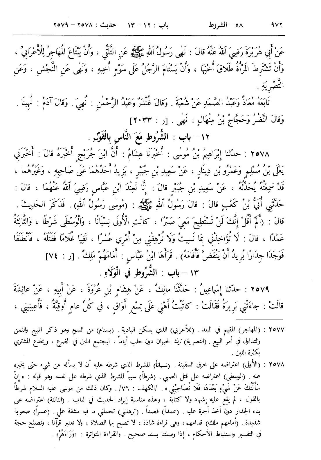 [ ش ( الأولى ) اعتراضه على خرق السفينة . ( نسيانا ) للشرط عليه أن لا يسأله عن شيء حتى يخبره عنه . ( الوسطى ) اعتراضه على قتل الصبي . ( شرطا ) سببا للشرط الذي شرطه على نفسه وهو قوله { إن سألتك عن شيء بعدها فلا تصاحبني } . / الكهف 76 / . وكان ذلك من موسى عليه السلام شرطا بالقول لم يقع عليه إشهاد ولا كتابة وهذه مناسبة إيراد الحديث في الباب . ( الثالثة ) اعتراضه على بناء الجدار دون أخذ أجرة عليه . ( عمدا ) قصدا . ( ترهقني ) تحملني ما فيه مشقة علي . ( عسرا ) صعوبة شديدة . ( أمامهم ملك ) قدامهم وهي قراءة شاذة لا تصح بها الصلاة ولا تعتبر قرآنا وتصلح حجة في التفسير واستنباط الأحكام إذا وصلتنا بسند صحيح . والقراءة المتواترة { وراءهم }