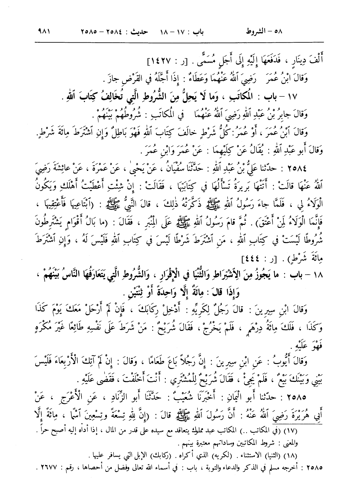 18 - باب ما يجوز من الاشتراط والثنيا في الإقرار والشروط التي يتعارفها الناس بينهم وإذا قال مائة إلا واحدة أو ثنتين