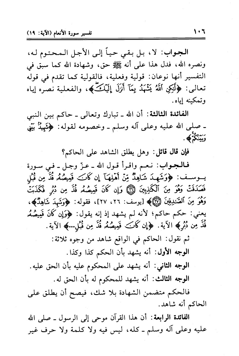 الفائدة الثالثة: أن الله - تبارك وتعالى - حاكم بين النبي - صلى الله عليه وعلى آله وسلم - وخصومه لقوله: {شَهِيدٌ بَيْنِي وَبَيْنَكُمْ}.