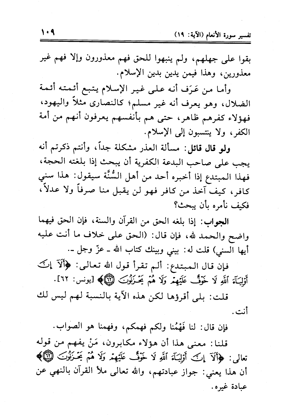 قلنا: معنى هذا أن هؤلاء مكابرون، مَنْ يفهم من قوله تعالى: {أَلَا إِنَّ أَوْلِيَاءَ اللَّهِ لَا خَوْفٌ عَلَيْهِمْ وَلَا هُمْ يَحْزَنُونَ (٦٢)} أن هذا يعني: جواز عبادتهم، والله تعالى ملأ القرآن بالنهي عن عبادة غيره.