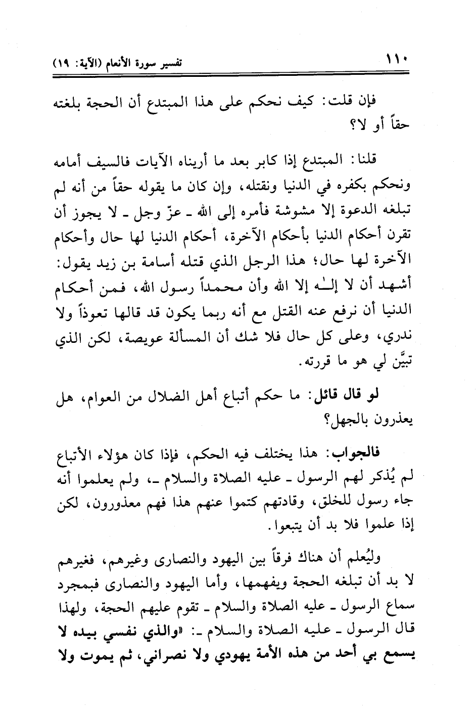 قلنا: المبتدع إذا كابر بعد ما أريناه الآيات فالسيف أمامه ونحكم بكفره في الدنيا ونقتله، وإن كان ما يقوله حقًا من أنه لم تبلغه الدعوة إلا مشوشة فأمره إلى الله - عزّ وجل - لا يجوز أن تقرن أحكام الدنيا بأحكام الآخرة، أحكام الدنيا لها حال وأحكام الآخرة لها حال؛ هذا الرجل الذي قتله أسامة بن زيد يقول: أشهد أن لا إله إلا الله وأن محمدًا رسول الله، فمن أحكام الدنيا أن نرفع عنه القتل مع أنه ربما يكون قد قالها تعوذًا ولا ندري، وعلى كل حال فلا شك أن المسألة عويصة، لكن الذي تبيَّن لي هو ما قررته.