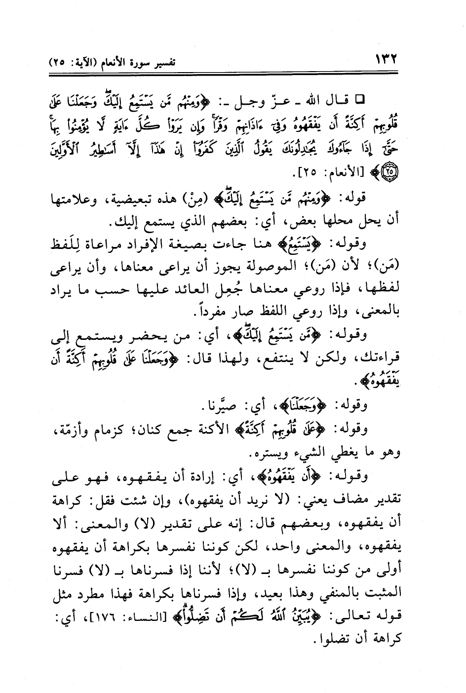 وقوله: {أَنْ يَفْقَهُوهُ}، أي: إرادة أن يفقهوه، فهو على تقدير مضاف يعني: (لا نريد أن يفقهوه)، وإن شئت فقل: كراهة أن يفقهوه، وبعضهم قال: إنه على تقدير (لا) والمعنى: ألا يفقهوه، والمعنى واحد، لكن كوننا نفسرها بكراهة أن يفقهوه أولى من كوننا نفسرها بـ (لا)؛ لأننا إذا فسرناها بـ (لا) فسرنا المثبت بالمنفي وهذا بعيد، وإذا فسرناها بكراهة فهذا مطرد مثل قوله تعالى: {يُبَيِّنُ اللَّهُ لَكُمْ أَنْ تَضِلُّوا} [النساء: ١٧٦]، أي: كراهة أن تضلوا.