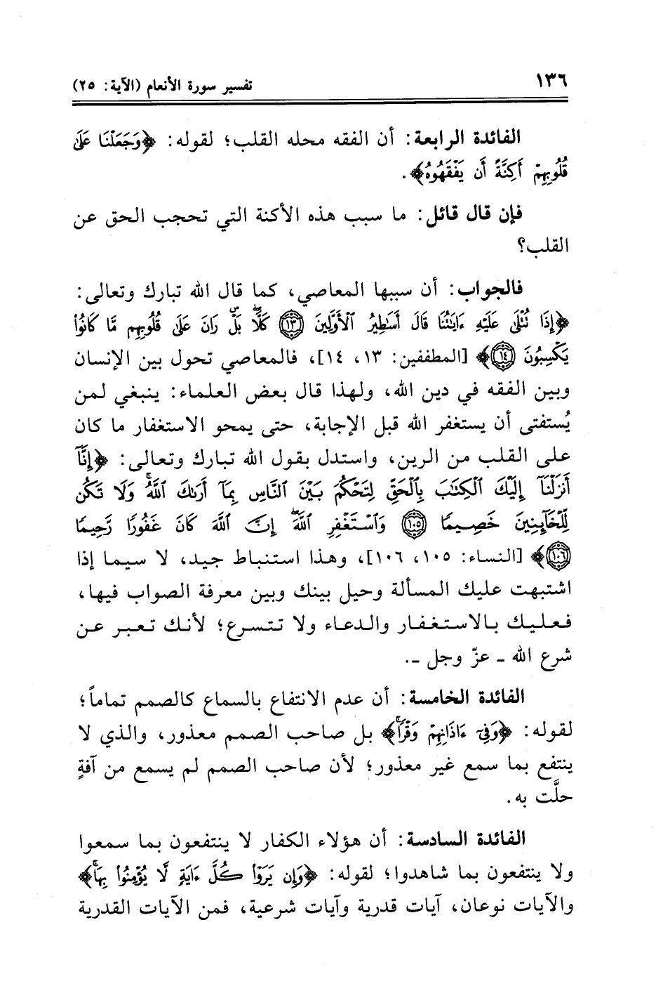 الفائدة الخامسة: أن عدم الانتفاع بالسماع كالصمم تمامًا؛ لقوله: {وَفِي آذَانِهِمْ وَقْرًا} بل صاحب الصمم معذور، والذي لا ينتِفع بما سمع غير معذور؛ لأن صاحب الصمم لم يسمع من آفةٍ حلَّت به.