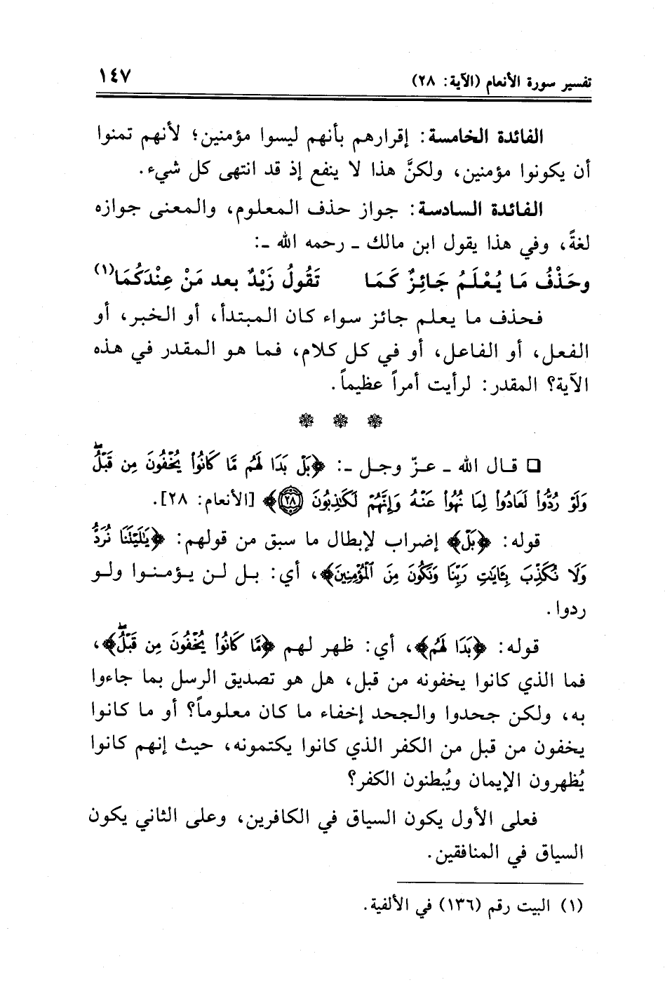 الفائدة السادسة: جواز حذف المعلوم، والمعنى جوازه لغةً، وفي هذا يقول ابن مالك - رحمه الله -: